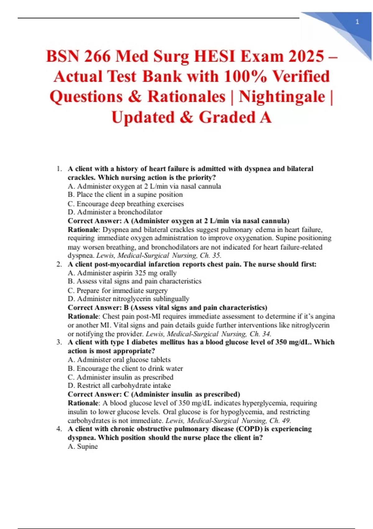 BSN 266 Med Surg HESI Exam 2025 – Actual Test Bank with 100% Verified Questions & Rationales | Nightingale | Updated & Graded A