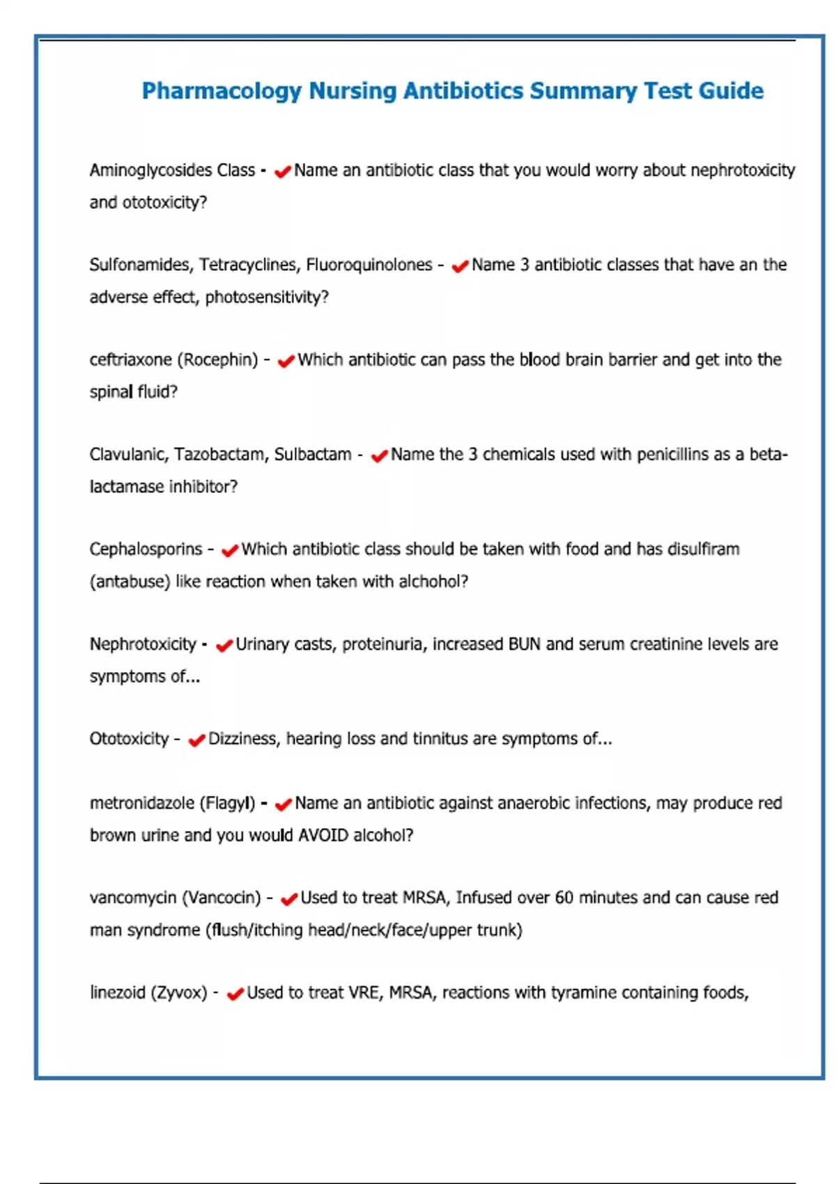 Pharmacology Nursing Antibiotics Summary Test Guide Aminoglycosides Class - Name an antibiotic class that you would worry about nephrotoxicity and ototoxicity? Sulfonamides, Tetracyclines, Fluoroquinolones - Name 3 antibiotic classes that have an the adverse effect, photosensitivity? ceftriaxone (Rocephin) - Which antibiotic can pass the blood brain barrier and get into the spinal fluid? Clavulanic, Tazobactam, Sulbactam - Name the 3 chemicals used with penicillins as a beta-lactamase inhibitor? Cephalosporins - Which antibiotic class should be taken with food and has disulfiram (antabuse) like reaction when taken with alchohol? Nephrotoxicity - Urinary casts, proteinuria, increased BUN and serum creatinine levels are symptoms of... Ototoxicity - Dizziness, hearing loss and tinnitus are symptoms of... metronidazole (Flagyl) - Name an antibiotic against anaerobic infections, may produce red brown urine and you would AVOID alcohol?