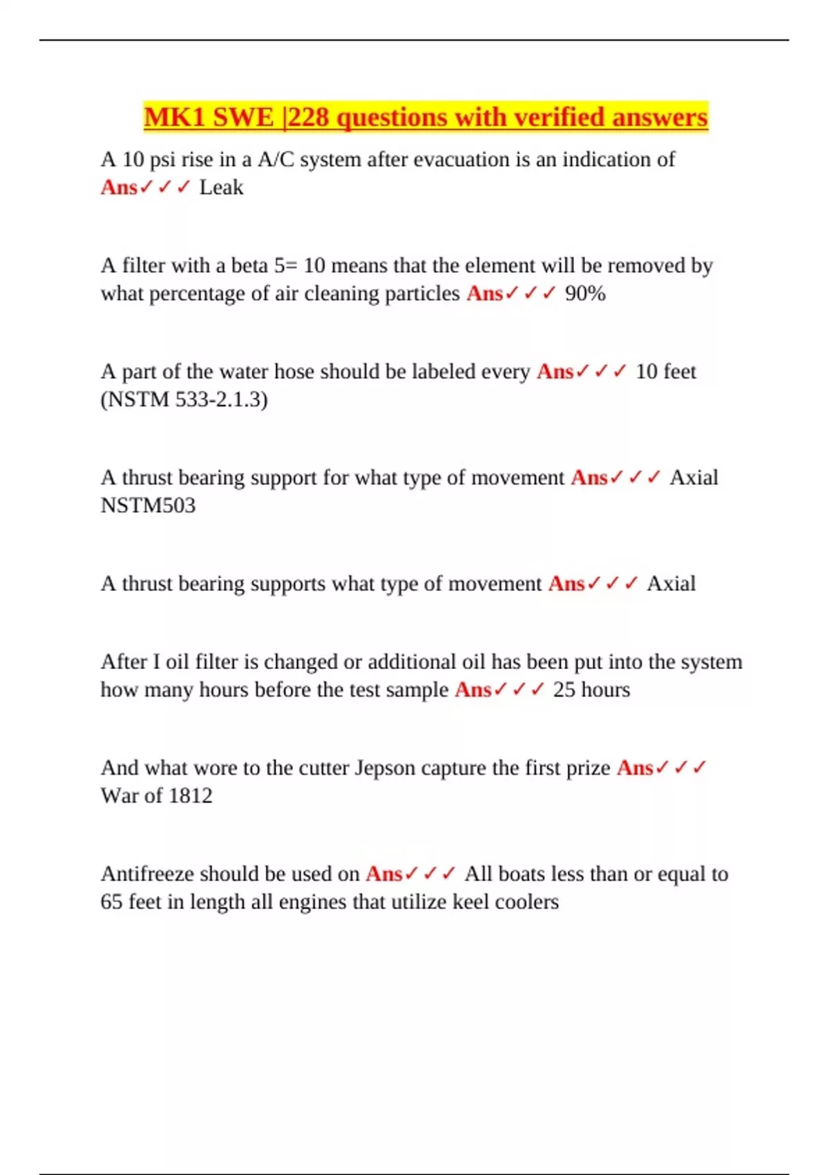 MK1 SWE – 228 Verified Questions and Answers for Coast Guard Machinery Technician Exam