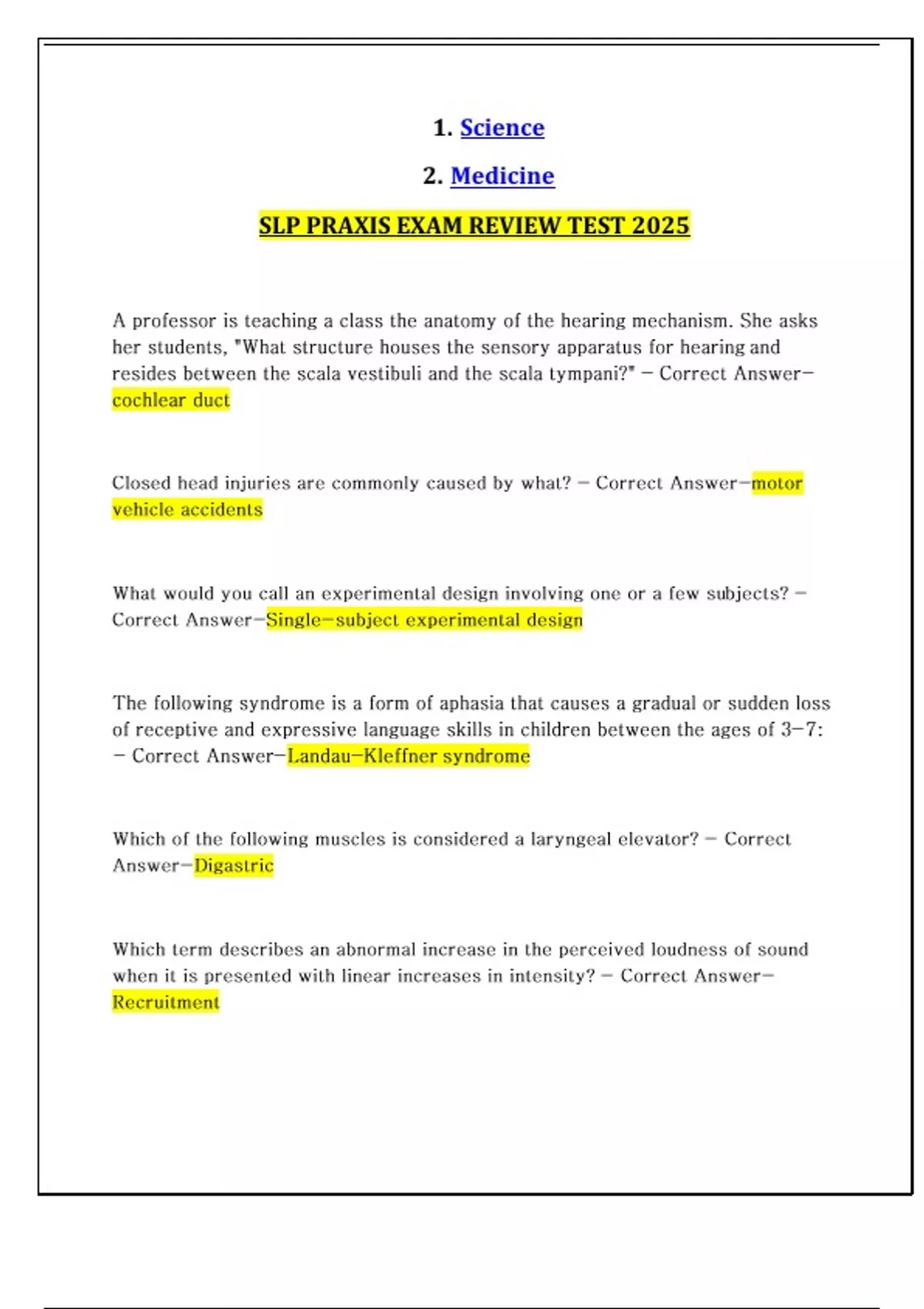 SLP PRAXIS EXAM REVIEW TEST 2025 A professor is teaching a class the anatomy of the hearing mechanism. She asks her students, "What structure houses the sensory apparatus for hearing and resides between the scala vestibuli and the scala tympani?" - Correct Answer-cochlear duct Closed head injuries are commonly caused by what? - Correct Answer-motor vehicle accidents What would you call an experimental design involving one or a few subjects? - Correct Answer-Single-subject experimental design The following syndrome is a form of aphasia that causes a gradual or sudden loss of receptive and expressive language skills in children between the ages of 3-7: - Correct Answer-Landau-Kleffner syndrome Which of the following muscles is considered a laryngeal elevator? - Correct Answer-Digastric Which term describes an abnormal increase in the perceived loudness of sound when it is presented with linear increases in intensity? - Correct Answer-Recruitment When sound waves move from one medium (e.g., air) to another (e.g., water), the motion causes a bending of the sound wave due to change in its speed of propagation. This phenomenon is known as - Correct Answer-refraction Which of the following is true about myopathie - Correct Answer-Myopathies are not associated with sensory deficits or central nervous system (CNS) pathology. Apraxia of speech (AOS) can be caused by any process that damages structures involved in motor speech programming. Which of the following etiologies is the most common cause of AOS? - Correct Answer...