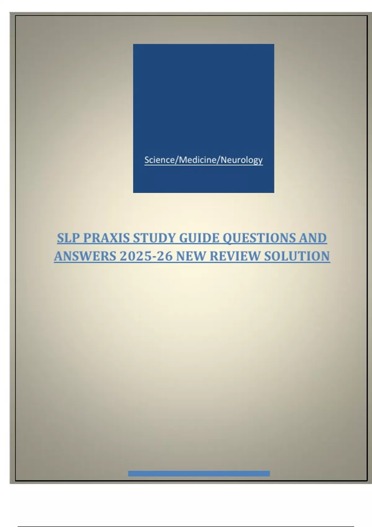 SLP PRAXIS STUDY GUIDEQUESTIONS AND ANSWERS 2025-26 NEW REVIEW SOLUTION The SLP observes the following: - Inconsistent articulatory errors, trial-and-error groping, and increased difficulty with volitional speech tasks compared to automatic ones. - Weak, imprecise articulation with slurred speech and reduced breath support, but consistent error patterns. - Patterns of speech sound errors such as fronting and final consonant deletion, with no history of neurological damage. - Difficulty producing specific speech sounds (e.g., /r/, /s/), with errors limited to a few phonemes and stable across contexts. Which of the following classifications best matches the order? A. Apraxia of speech, dysarthria, phonological disorder, articulation disorder B. Dysarthria, apraxia of speech, articulation disorder, phonological disorder C. Apraxia of speech, articulation disorder, phonological disorder, dysarthria D. Phonological disorder, dysarthria, apraxia of speech, articulation disorder - Correct Answer-A. Apraxia of speech, dysarthria, phonological disorder, articulation disorder A patient presents with a breathy voice and difficulty with pitch modulation following thyroid surgery. Laryngeal examination reveals unilateral vocal fold paralysis in the paramedian position. Which of the following cranial nerve branches is most likely responsible for the breathy vocal quality, and which is most likely responsible for the impaired pitch control, respectively? A. SLN; RLN B. RLN; SLN C. SLN; SLN D. RLN; RLN E. Hypoglossal nerve; SLN - Correct Answer-B. RLN; SLN Rationale: - Breathy voice = likely RLN damage, which innervates all intrinsic laryngeal muscles except cricothyroid and is responsible for vocal fold adduction/abduction. - Pitch modulation issues = likely SLN damage, which innervates the cricothyroid muscle, key for pitch control. A 65-year-old patient presents with halting, effortful speech following a left hemisphere stroke. The speech-language pathologist notes that the patient omits function words and grammatical markers, producing utterances such as "want... coffee" and "go... store... now." This type of expressive language pattern is best described as: A. Agrammatic speech characteristic of Wernicke's aphasia B. Circumlocutory speech characteristic of transcortical sensory aphasia C. Telegraphic speech characteristic of Broca's aphasia D. Press of speech characteristic of global aphasia E. Paraphasic speech characteristic of conduction aphasia - Correct Answer-C. Telegraphic speech characteristic of Broca's aphasia Rationale: - Telegraphic speech involves the omission of function words (e.g., "is," "the") and is common in Broca's aphasia, a nonfluent aphasia. - The patient produces mainly content words with reduced grammatical structure. During phonation, vocal folds are set into motion through a combination of subglottal pressure and aerodynamic forces. One of these forces—the Bernoulli Continues....