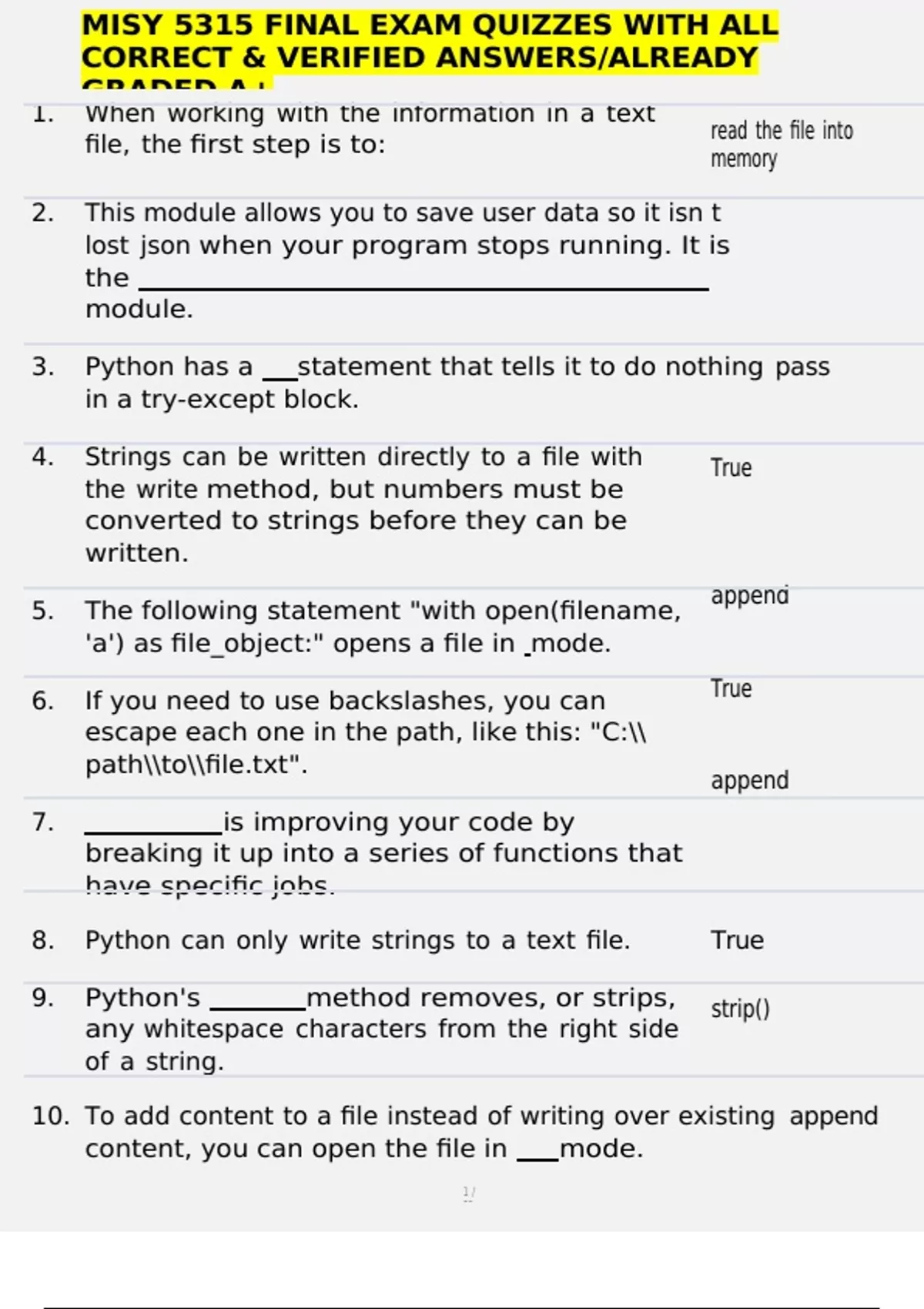 , MISY 5315 FINAL EXAM QUIZZES WITH ALL