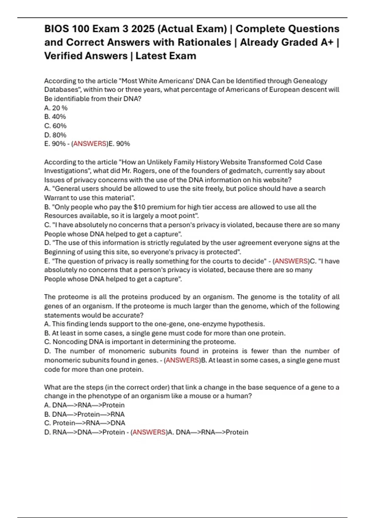 ,BIOS 100 Exam 3 2025 (Actual Exam) | Complete Questions