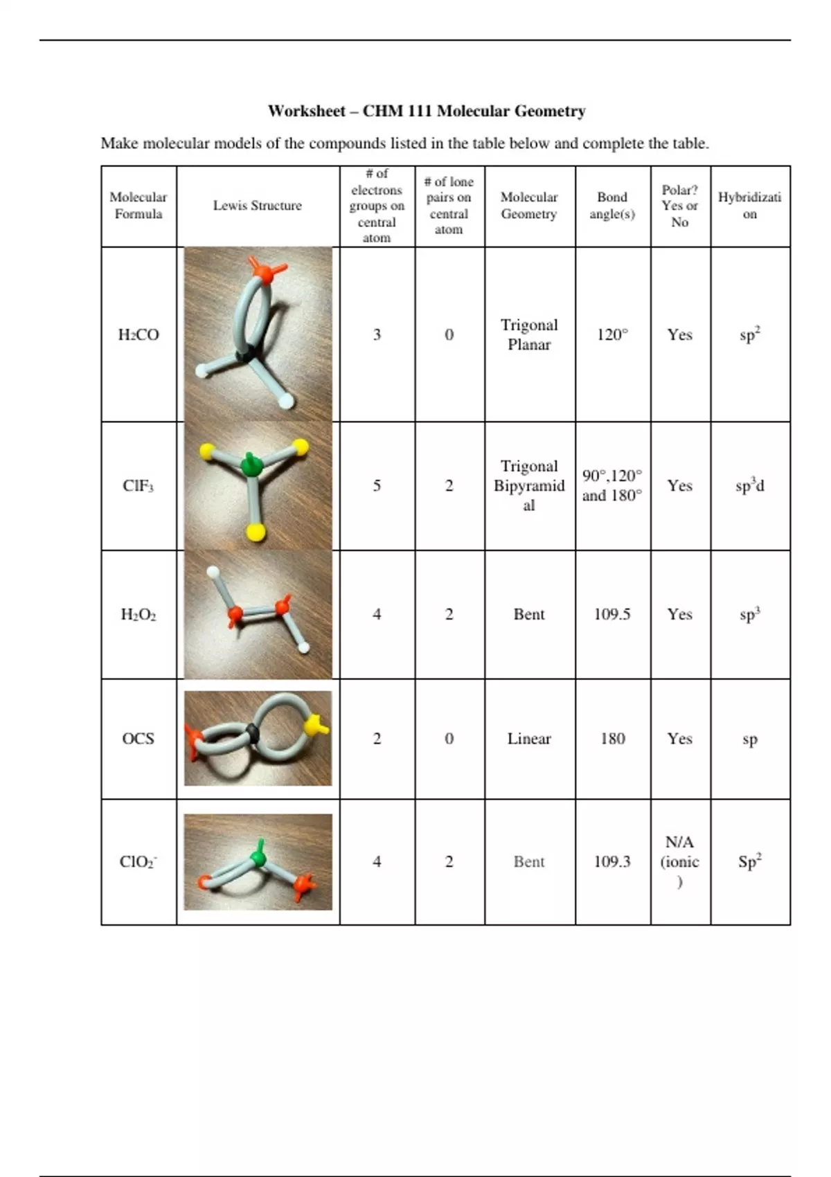 This is a worksheet the is from chemistry lab 111 for Molecular geometry