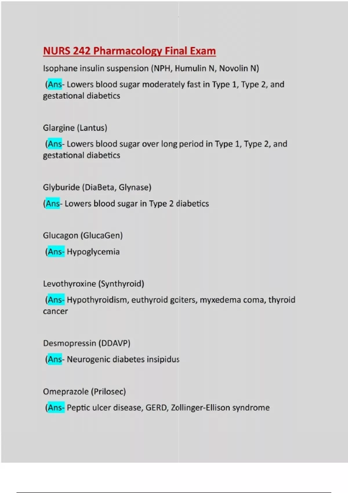 Isophane insulin suspension (NPH, Humulin N, Novolin N) (Ans- Lowers blood sugar moderately fast in Type 1, Type 2, and gestational diabetics Glargine (Lantus) (Ans- Lowers blood sugar over long period in Type 1, Type 2, and gestational diabetics Glyburide (DiaBeta, Glynase) (Ans- Lowers blood sugar in Type 2 diabetics Glucagon (GlucaGen) (Ans- Hypoglycemia Levothyroxine (Synthyroid) (Ans- Hypothyroidism, euthyroid goiters, myxedema coma, thyroid cancer Desmopressin (DDAVP) (Ans- Neurogenic diabetes insipidus Omeprazole (Prilosec) (Ans- Peptic ulcer disease, GERD, Zollinger-Ellison syndromeSucralfate (Carafate) (Ans- Peptic ulcer disease Calcium carbonate (Tums) (Ans- Peptic ulcer disease, GERD Ondansetron (Zofran) (Ans- Nausea and vomiting due to chemo, radiation therapy, postop Bisacodyl (Dulcolax) (Ans- Constipation, neurogenic bowel dysfunction, bowel prep before medical exam or surgery Pseudoephedrine (Sudafed) (Ans- Nasal congestion during surgery Albuterol (Proventil) (Ans- Long term asthma, exercise induced asthma Heparin (Ans- Prophylaxis for DVT and pulmonary embolism