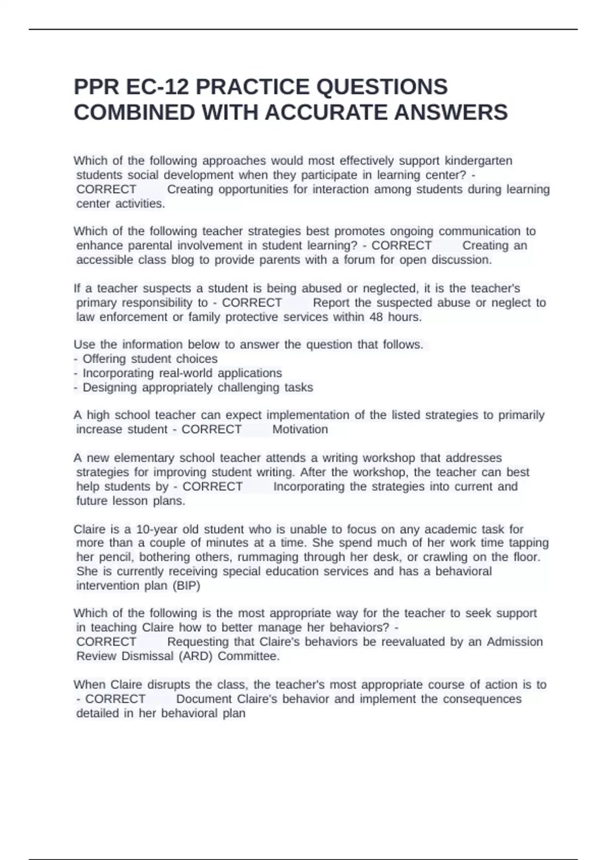 PPR EC-12 PRACTICE QUESTIONS