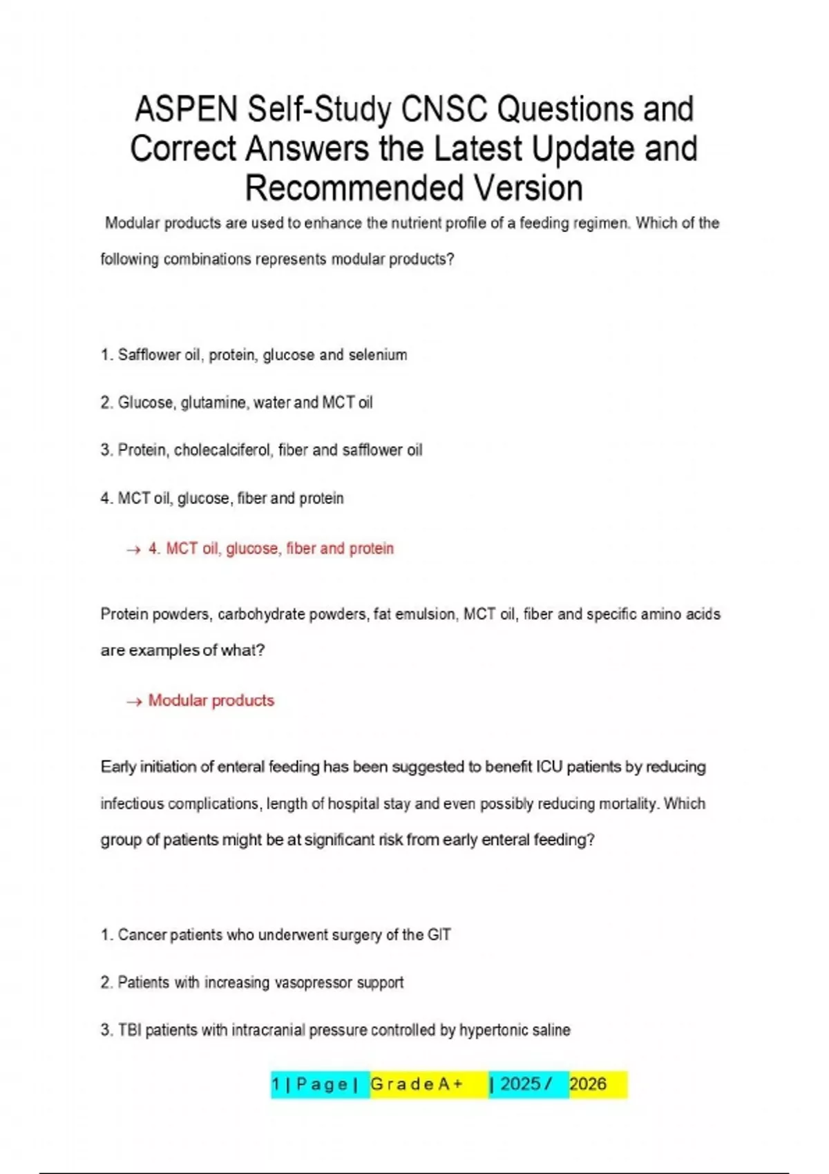 ASPEN Self-Study CNSC – Aspen | 2025/2026 – Practice Questions with Correct Answers