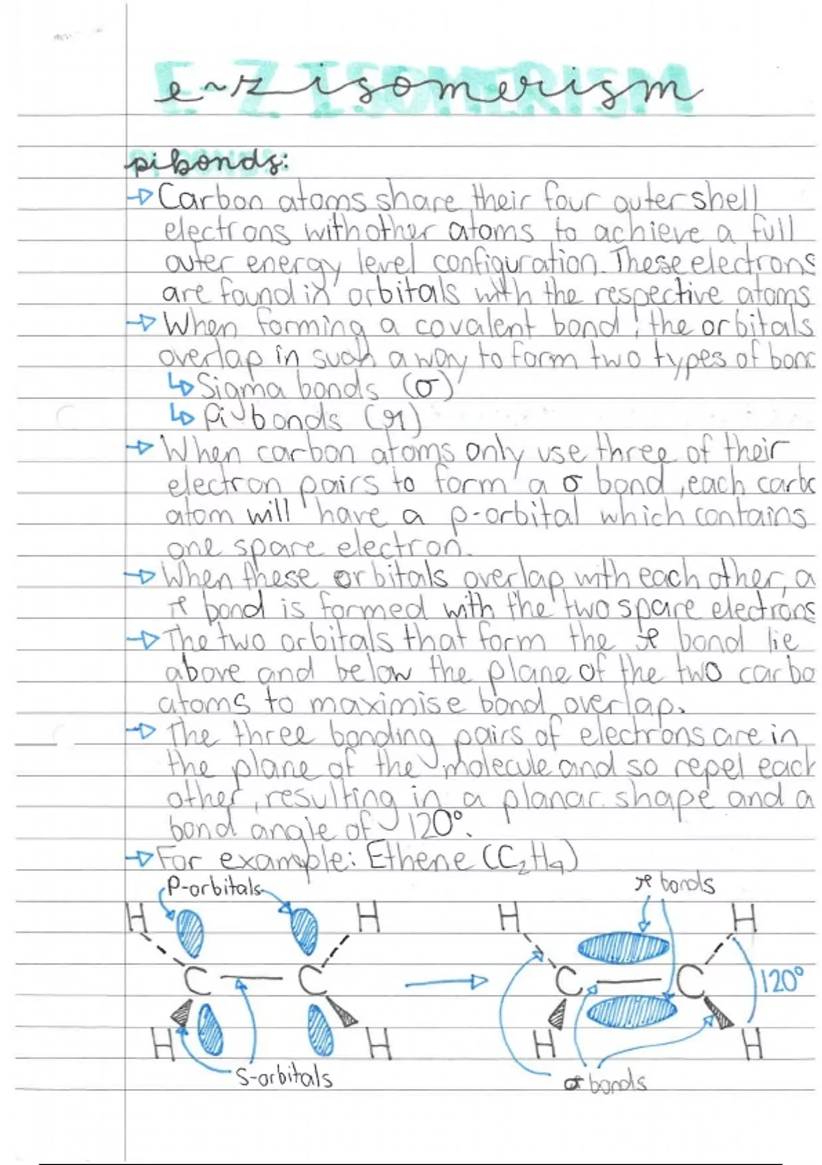 AQA A-Level chemistry notes covering all areas of alkenes, such as E/Z isomerism, pi bonds, electrophilic addition, carbocation stability, etc. Predicted A* quality.
