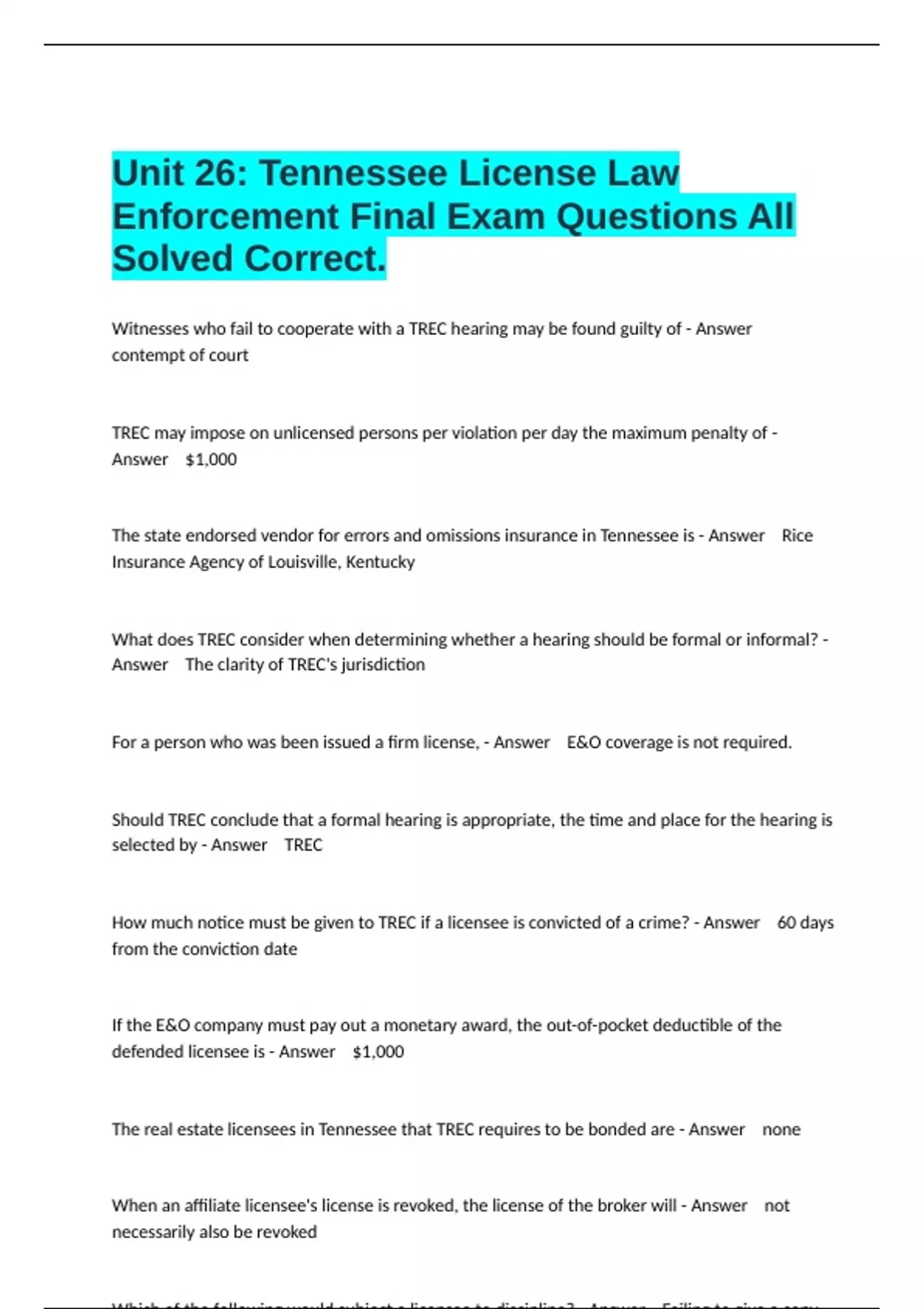 The state endorsed vendor for errors and omissions insurance in Tennessee is - Answer Rice