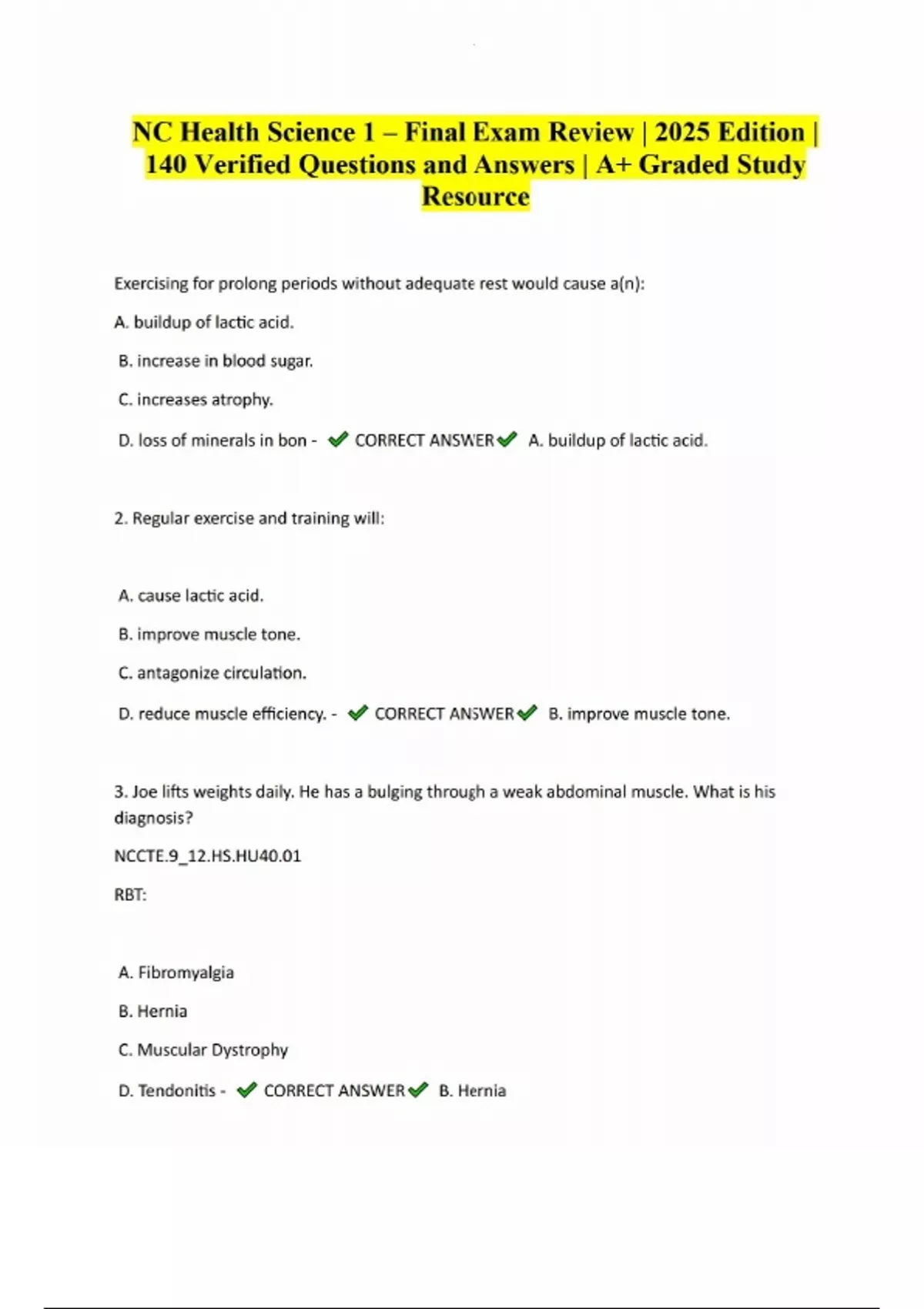 NC Health Science 1 – Final Exam Review | 2025 Edition | 140 Verified Questions and Answers | A+ Graded Study Resource Exercising for prolong periods without adequate rest would cause a(n): A. buildup of lactic acid. B. increase in blood sugar. C. increases atrophy. D. loss of minerals in bon - ️ CORRECT ANSWER️ A. buildup of lactic acid. 2. Regular exercise and training will: A. cause lactic acid. B. improve muscle tone. C. antagonize circulation. D. reduce muscle efficiency. - ️ CORRECT ANSWER️ B. improve muscle tone. 3. Joe lifts weights daily. He has a bulging through a weak abdominal muscle. What is his diagnosis? NCCTE.9_12.HS.HU40.01 RBT: A. Fibromyalgia B. Hernia C. Muscular Dystrophy D. Tendonitis - ️ CORRECT ANSWER️ B. Hernia 4. When Joe flexes his bicep, what characteristic of muscles describes what is happening to his bicep? NCCTE.9_12.HS.HU40.01 RBT: A. Contractibility B. Elasticity C. Excitability D. Extensibility - ️ CORRECT ANSWER️ A. Contractibility