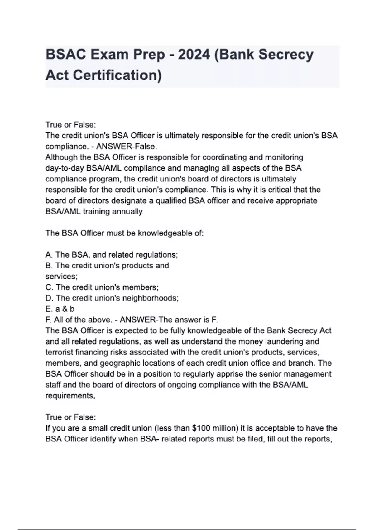 BSAC Exam Prep - 2024 (Bank Secrecy Act Certification) questions and answers