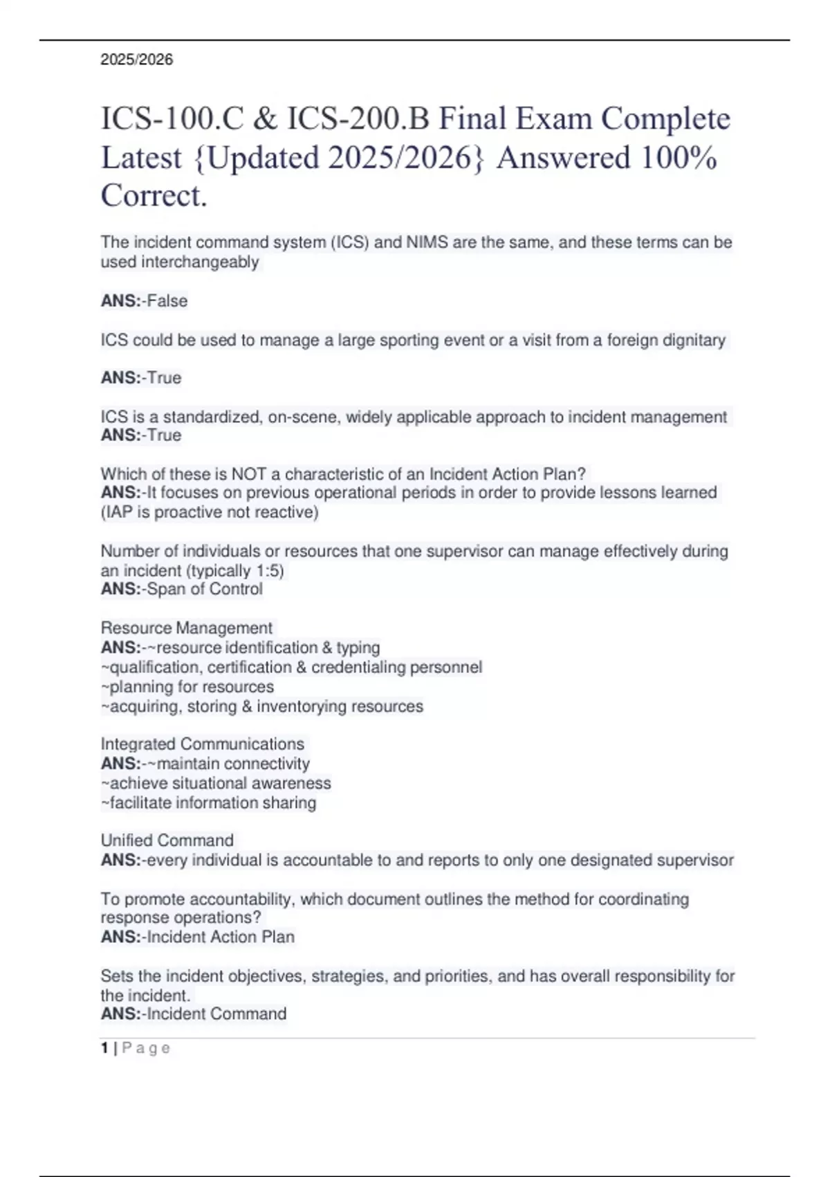 This document contains a fully answered and updated final exam guide for ICS-100.C and ICS-200.B as of the 2025/2026 academic year. It includes 100% correct answers to all questions based on FEMA’s Incident Command System and NIMS curriculum. Covered topics include command structure, incident action planning, resource management, operational sections, and ICS organizational types. Ideal for emergency management professionals, students, and first responders preparing for certification or assessment.