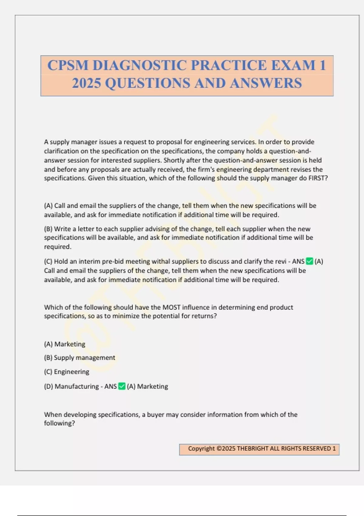 A supply manager issues a request to proposal for engineering services. In order to provide clarification on the specification on the specifications, the company holds a question-and- answer session for interested suppliers. Shortly after the question-and-answer session is held and before any proposals are actually received, the firm's engineering department revises the specifications. Given this situation, which of the following should the supply manager do FIRST? (A) Call and email the suppliers of the change, tell them when the new specifications will be available, and ask for immediate notification if additional time will be required. (B) Write a letter to each supplier advising of the change, tell each supplier when the new specifications will be available, and ask for immediate notification if additional time will be required. (C) Hold an interim pre-bid meeting withal suppliers to discuss and clarify the revi - ANS (A) Call and email the suppliers of the change, tell them when the new specifications will be available, and ask for immediate notification if additional time will be required. Which of the following should have the MOST influence in determining end product specifications, so as to minimize the potential for returns? (A) Marketing (B) Supply management (C) Engineering (D) Manufacturing - ANS (A) Marketing When developing specifications, a buyer may consider information from which of the following? CPSM DIAGNOSTIC PRACTICE EXAM 1 2025 QUESTIONS AND ANSWERS Copyright ©2025 THEBRIGHT ALL RIGHTS RESERVED 2 I. Suppliers II. Industry Standards III. Professional Organizations IV. Competitors (A) I and IV only (B) II and III only (C) I, II and III only (D) I, II, III and IV - ANS (D) I, II, III and IV A supply manager completes a category profile and identifies services provided through multiple suppliers. A market and industry analysis shows that the service provides are growing their businesses by acquiring competitors, thus enabling them to provide a greater range of services. Which of the following techniques will BEST enable the supply manager to leverage market competition? (A) Lotting strategy (B) Market-basket model (C) Market segmentation (D) Sole sourcing - ANS (A) Lotting strategy A supply manager implements a system whereby the potential supplier names are hidden until final contract awards are made. This example is BEST described as ensuring (A) confidential information is protected (B) diversity initiatives are met (C) total costs are minimized (D) collusion will not occur - ANS (A) confidential information is protected Copyright ©2025 THEBRIGHT ALL RIGHTS RESERVED 3 A supply manager for a privately held manufacturing company is preparing an RFP for raw materials. None of the RFP recipients is an incumbent, and the award resulting from the RFP is expected to be of significant dollar value. The supply manager is concerned that the lack of publicly available financial information could impact willingness of the prospective suppliers to submit proposals. Which of the following will BEST address the concerns of the prospective bidders? (A) Escrow account (B) Letter of credit (C) Payment bond (D) Surety bond - ANS (B) Letter of credit Which of the following is the LEAST critical element in a best alternative to a negotiated agreement (BATNA)? (A) Alternate products (B) In-house capabilities (C) Source options (D) Supplier capabilities - ANS (D) Supplier capabilities A supply manager is negotiating with a critical supplier. The parties have relatively equal bargaining power. Which of the following would MOST likely occur in "win-win" negotiation between these parties? (A) The supply manager and supplier conclude the negotiation by splitting the difference between their respective positions. (B) The supply manager and supplier each find concessions with equal weight/value to provide a balanced outcome. (C) The supply manager and supplier decide to share confidential information. (D) The supply ma