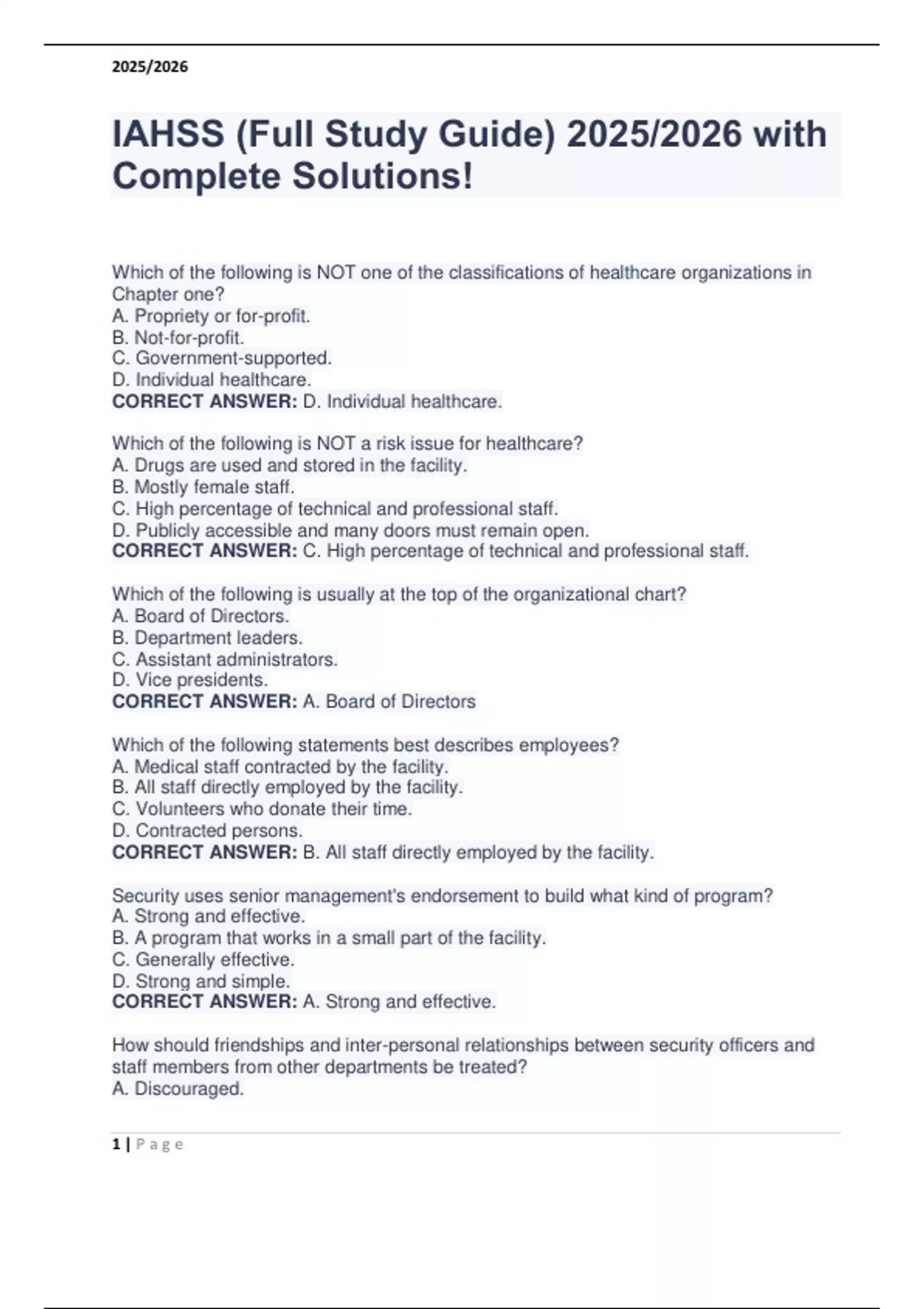This document provides the complete 2025/2026 IAHSS (International Association for Healthcare Security and Safety) study guide with fully answered practice questions. It covers key topics required for basic, advanced, and supervisory healthcare security officer certifications, including risk management, patrol methods, legal responsibilities, emergency response, access control, workplace violence prevention, and more. Ideal for exam preparation or security training in healthcare environments.