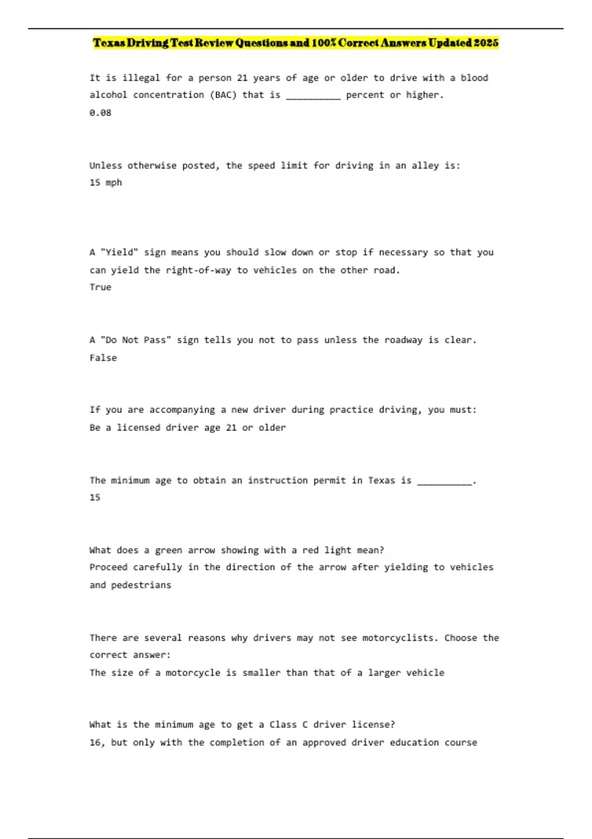 , Texas Driving Test Review Questions and 100% Correct Answers Updated 2025