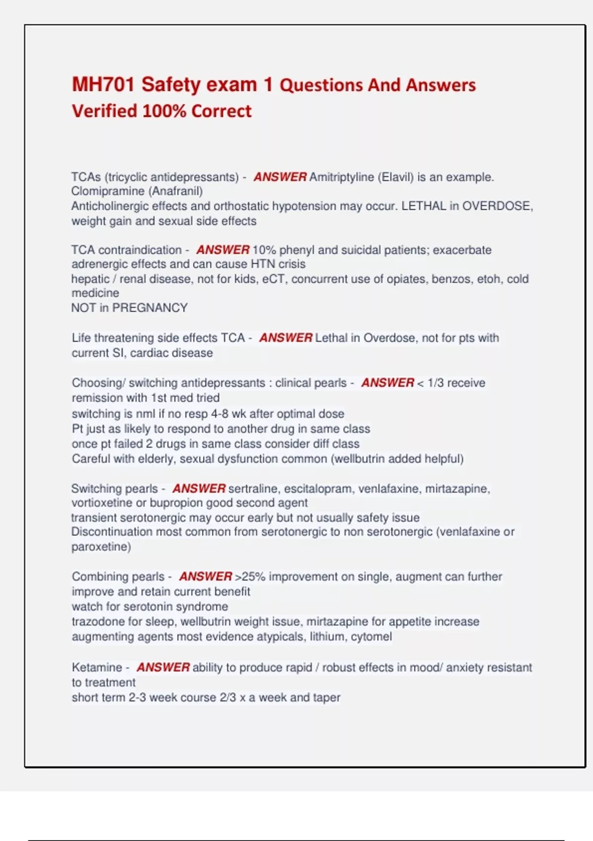 MH701 Safety exam 1 Questions And Answers Verified 100% Correct TCAs (tricyclic antidepressants) - ANSWER Amitriptyline (Elavil) is an example. Clomipramine (Anafranil) Anticholinergic effects and orthostatic hypotension may occur. LETHAL in OVERDOSE, weight gain and sexual side effects TCA contraindication - ANSWER 10% phenyl and suicidal patients; exacerbate adrenergic effects and can cause HTN crisis hepatic / renal disease, not for kids, eCT, concurrent use of opiates, benzos, etoh, cold medicine NOT in PREGNANCY Life threatening side effects TCA - ANSWER Lethal in Overdose, not for pts with current SI, cardiac disease Choosing/ switching antidepressants : clinical pearls - ANSWER < 1/3 receive remission with 1st med tried switching is nml if no resp 4-8 wk after optimal dose Pt just as likely to respond to another drug in same class once pt failed 2 drugs in same class consider diff class Careful with elderly, sexual dysfunction common (wellbutrin added helpful) Switching pearls - ANSWER sertraline, escitalopram, venlafaxine, mirtazapine, vortioxetine or bupropion good second agent transient serotonergic may occur early but not usually safety issue Discontinuation most common from serotonergic to non serotonergic (venlafaxine or paroxetine) Combining pearls - ANSWER >25% improvement on single, augment can further improve and retain current benefit watch for serotonin syndrome trazodone for sleep, wellbutrin weight issue, mirtazapine for appetite increase augmenting agents most evidence atypicals, lithium, cytomel Ketamine - ANSWER ability to produce rapid / robust effects in mood/ anxiety resistant to treatment short term 2-3 week course 2/3 x a week and taper scarcity of safety and long term 3 most common neurotransmitters with anxiety - ANSWER Norepinephrine serotonin GABA first line pharm for panic disorder - ANSWER SSRI paxil (paroxetine) Fluoxetine (prozac) Sertraline (zoloft) are FDA approved for panic SSRI > Benzo BUT alprazolam (xanax) & clonazepam (klonopin) also FDA approved Pharm for Anxiety Pearls - ANSWER -conservative approach = paroxetine, sertraline citalopram in isolated panic disorder -rapid control of symptoms = brief alprazolam concurrently with ssri and taper benzo long term Fluoxetine (prozac) effective for panic / depression 1st couple of weeks mimic panic symptoms Klonopin can be taken prn for anticipate panic 0.5-1 mg Education on Benzos - ANSWER avoid ETOH or other CNS depressant meds avoid driving/ operating when used in short periods 1/2 weeks usually have no tolerance/ dependance/ withdrawal > 12 weeks high rate of dependance 1st line pharm for Agoraphobia - ANSWER SSRI (1st line panic w or w-out agoraphobia) benzo rapid onset PRN xanax, ativan TCA's most effective dosage must be titrated slowly to avoid jitteriness and may not be achieved for 8-12 wks Social Anxiety Disorder (1st line therapy) - ANSWER 1. SSRI, 2. Benzo 3. venalfaxine (effexor) 4. Buspirone (buspar) buspirone shown best to augment SAD pharm for performance situations - ANSWER Beta blocker (b-adrenergic receptor antagonist) shortly before Tenormin 50-100 mg 1 hr, or propranolol 20-40 mg or lorazepam/ alprazolam GAD 1st line pharm - ANSWER SSRI FDA approved : Escitalopram (lexapro) *Paroxetine (Paxil) off label but EBP *citalopram (celexa) Fluoxetine (prozac) *Sertraline (zoloft) reasonable to begin treatment with SSRI plus benzo and then taper benzo after 2-3 weeks GAD treatment when not responding to SSRI - ANSWER Consider Venlafaxine (Effexor) Duloxetine (cymbalta) Consider anxiolytic buspirone (buspar) benzo alprazolam (xanax) for short term use (FDA +) Vistaril (hydroxyzine) histamine blocker help s/s may cause sedation Education on Benzo - ANSWER strong propensity for abuse (best for) 1-2 weeks while SSRI kicking in long term / high dose = depression /dementia increased GABA = decreased reactivity of brain benzo prevent pt working through root cause abrupt withdrawal can cause s/s seizures and can potentiate effects of etoh Advantages of Buspirone for treatment of Anxiety - ANSWER similar to benzo in its effect no physical dependence, withdrawal/ abuse less sedation / psychomotor impairment lack of interaction with etoh Risk of using buspirone and SSRI for trmt of anxiety - ANSWER small chance of increasing risk of serotonin syndrome Common treatment for OCD - ANSWER SSRI fluoxetine (Prozad) fluvoxamine (luvox), Paroxetine (paxil) sertraline (zoloft) TCA = clomipramine Common treatment for PTSD - ANSWER -SSRI : sertraline / Paroxetine (paxil) considered 1st line d/t efficacy, tolerability and safety ratings -Buspirone (Buspar) is serotonergic and may also be of use -Benzo "relatively contraindicated" TCA's used for PTSD - ANSWER Imipramine (tofranil) amitriptyline (elavil) Prazosin (Minipress) How helpful with PTSD - ANSWER suppress nightmares, particularly associated with ptsd excessive adrenaline can cause nightmares , blocks the noradrenergic stimulation of the alpha 1 receptor Drugs that affect GABA slowing down neurotransmission and decreasing the reactivity of brain - ANSWER Benzo Short acting intermediate long acting triazolam alprazolam flurazepam Barbiturates thiopental secobarbital phenobarbital