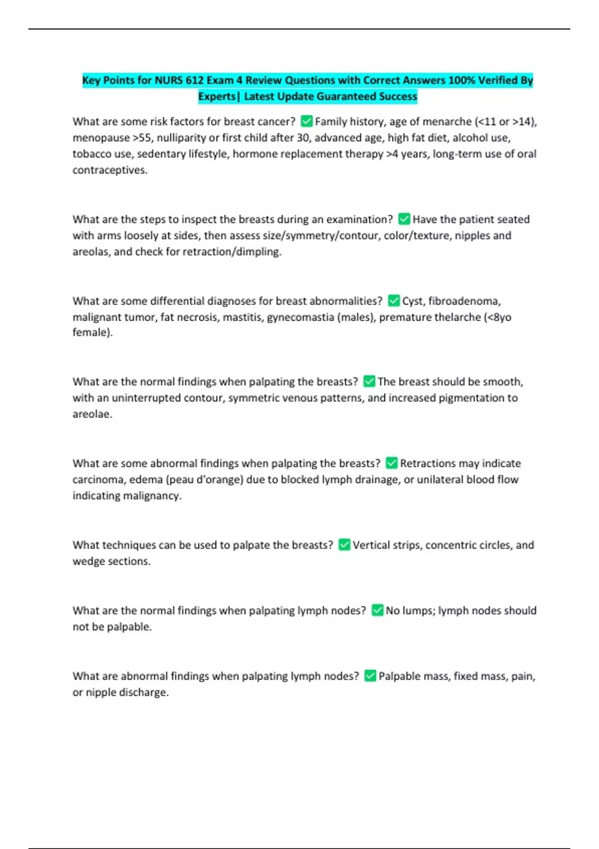 Key Points for NURS 612 Exam 4 Review Questions with Correct Answers 100% Verified By
