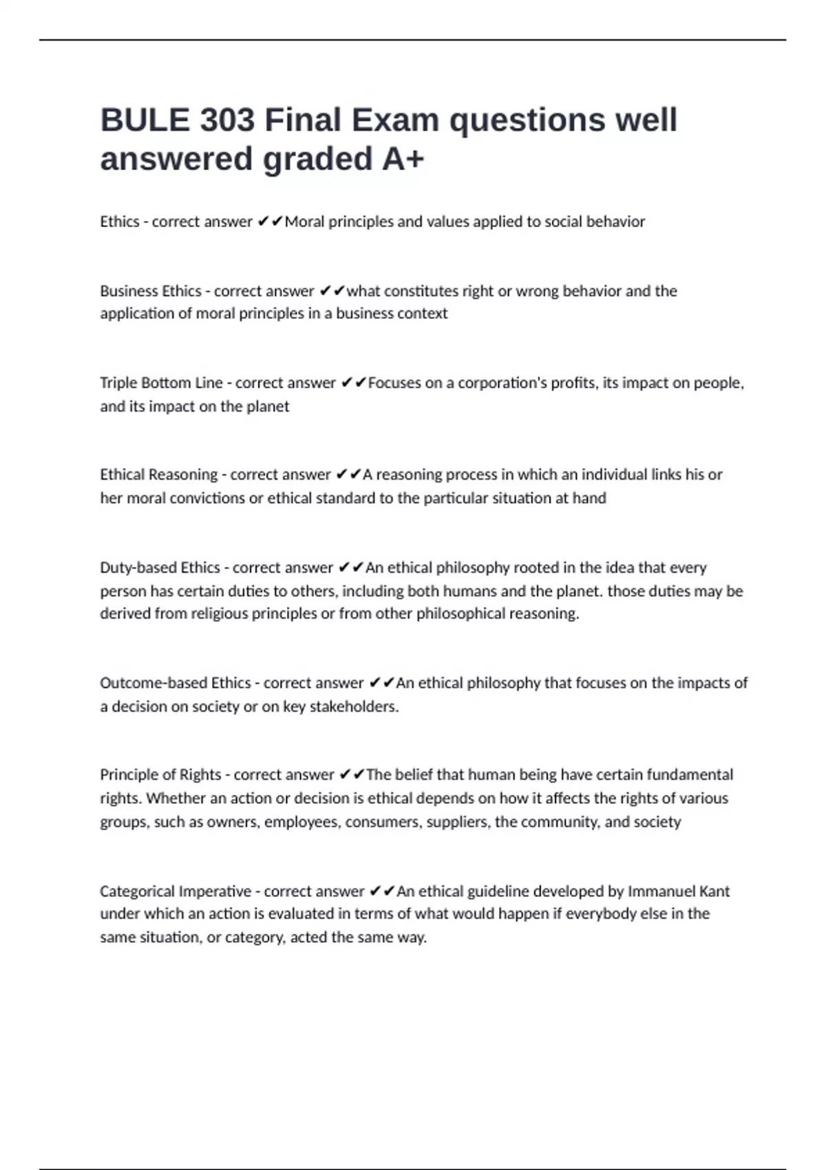 Duty-based Ethics - correct answer ✔✔An ethical philosophy rooted in the idea that every