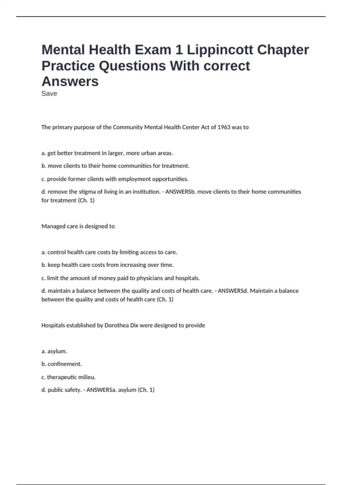Mental Health Exam 1 Lippincott Chapter Practice Questions With correct Answers