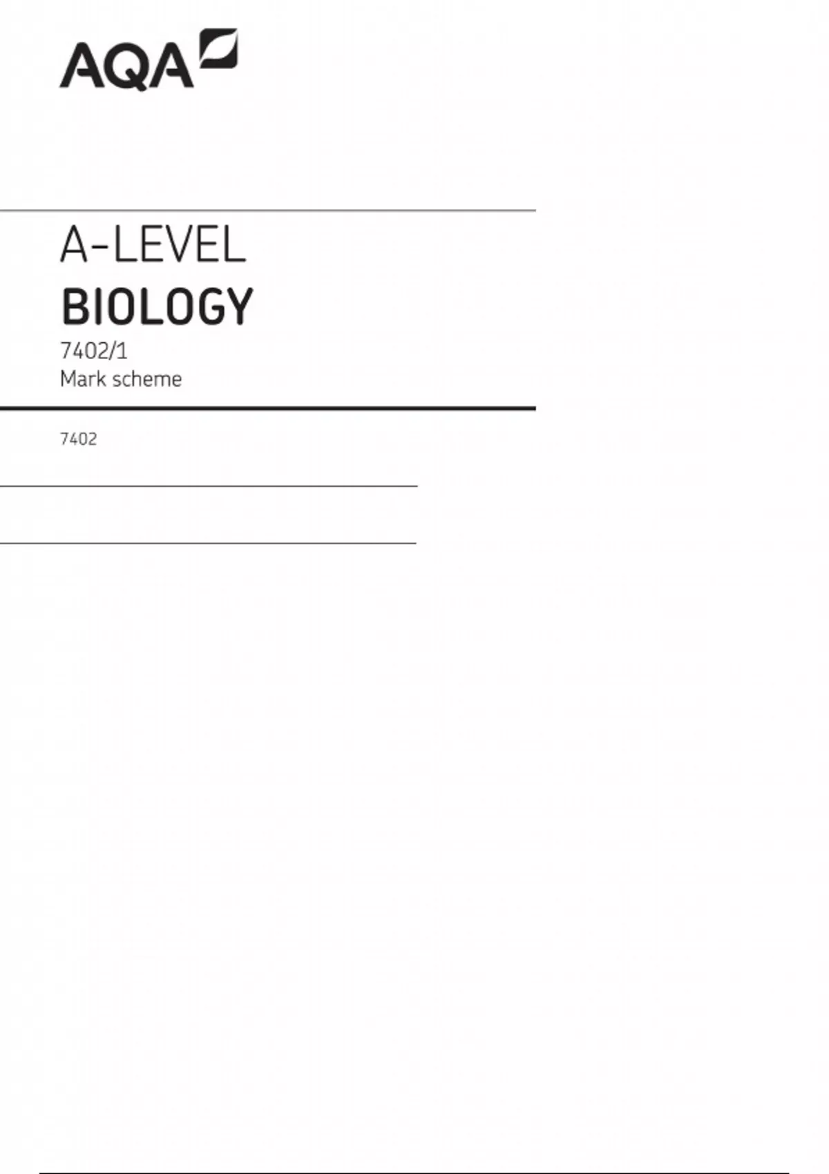 This document contains the full AQA A-Level Biology Paper 1, revised for 2025 study use, along with the official marking scheme. It covers all key topics from the A-level specification, including biological molecules, cells, transport systems, DNA and genetics, and ecological interactions. The included mark scheme allows students to self-assess their answers and understand how marks are awarded in real AQA exams.