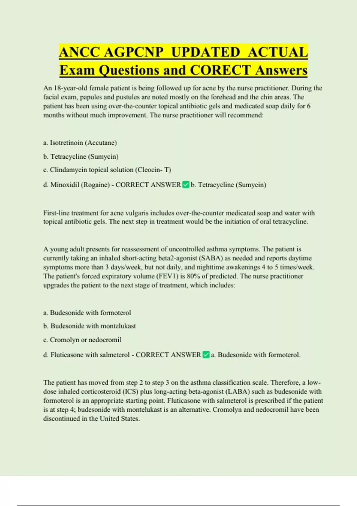 ANCC AGPCNP UPDATED ACTUAL Exam Questions and CORECT Answers An 18-year-old female patient is being followed up for acne by the nurse practitioner. During the facial exam, papules and pustules are noted mostly on the forehead and the chin areas. The patient has been using over-the-counter topical antibiotic gels and medicated soap daily for 6 months without much improvement. The nurse practitioner will recommend: a. Isotretinoin (Accutane) b. Tetracycline (Sumycin) c. Clindamycin topical solution (Cleocin- T) d. Minoxidil (Rogaine) - CORRECT ANSWER b. Tetracycline (Sumycin) First-line treatment for acne vulgaris includes over-the-counter medicated soap and water with topical antibiotic gels. The next step in treatment would be the initiation of oral tetracy