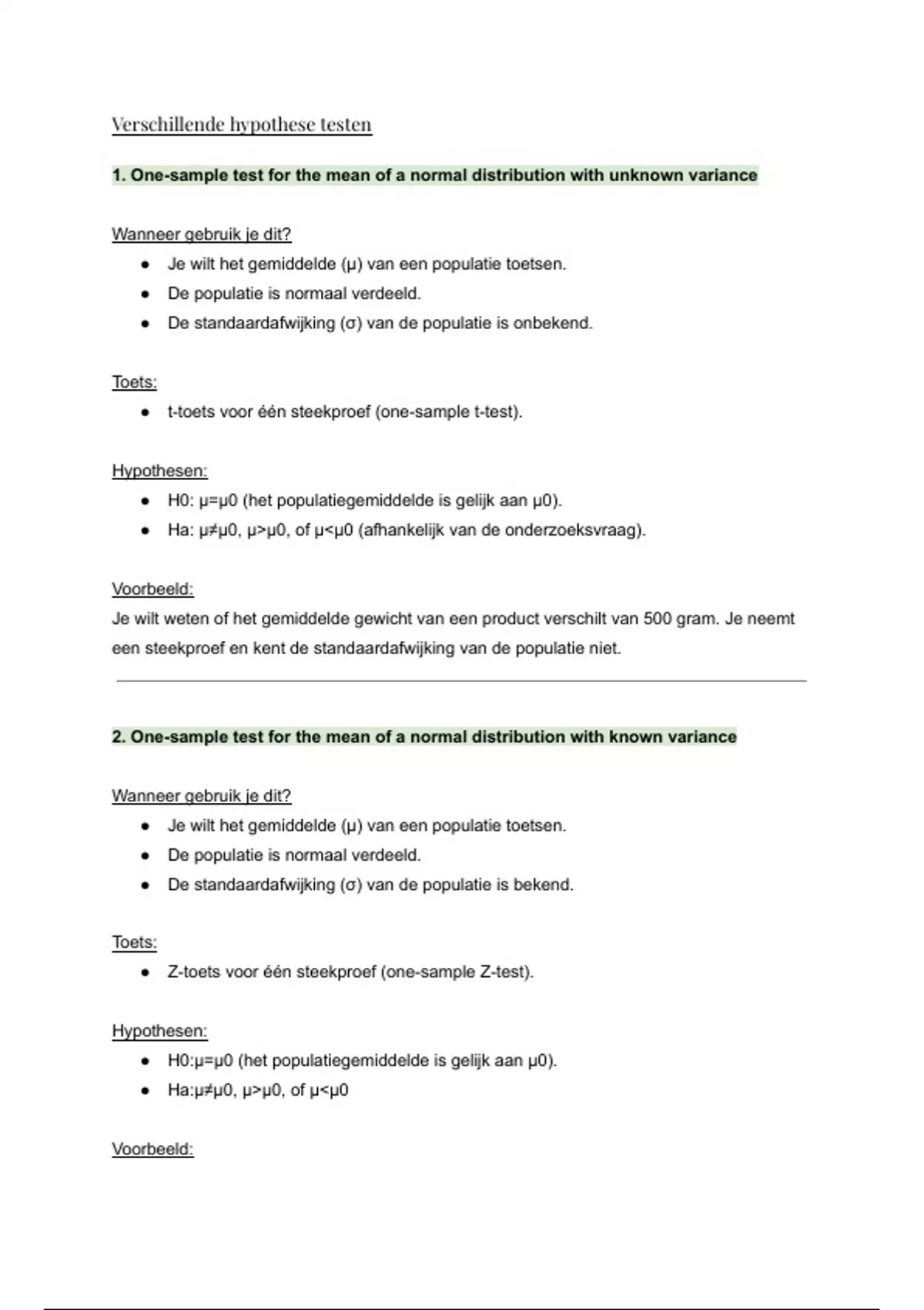 ● H0: μ=μ0 (het populatiegemiddelde is gelijk aan μ0).