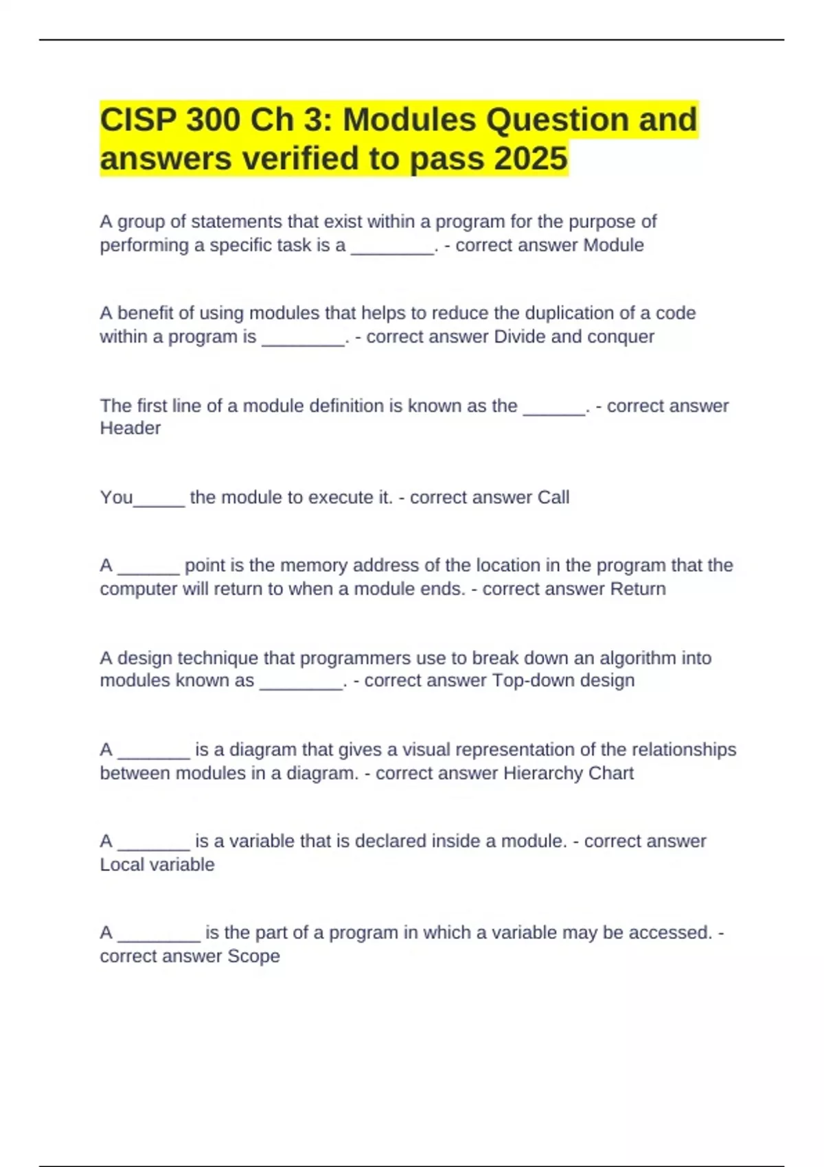 CISP 300 Ch 3: Modules Question and answers verified to pass 2025 A group of statements that exist within a program for the purpose of performing a specific task is a ________. - correct answer Module A benefit of using modules that helps to reduce the duplication of a code within a program is ________. - correct answer Divide and conquer The first line of a module definition is known as the ______. - correct answer Header You_____ the module to execute it. - correct answer Call A ______ point is the memory address of the location in the program that the computer will return to when a module ends. - correct answer Return A design technique that programmers use to break down an algorithm into modules known as ________. - correct answer Top-down design A _______ is a diagram that gives a visual representation of the relationships between modules in a diagram. - correct answer Hierarchy Chart A _______ is a variable that is declared inside a module. - correct answer Local variable