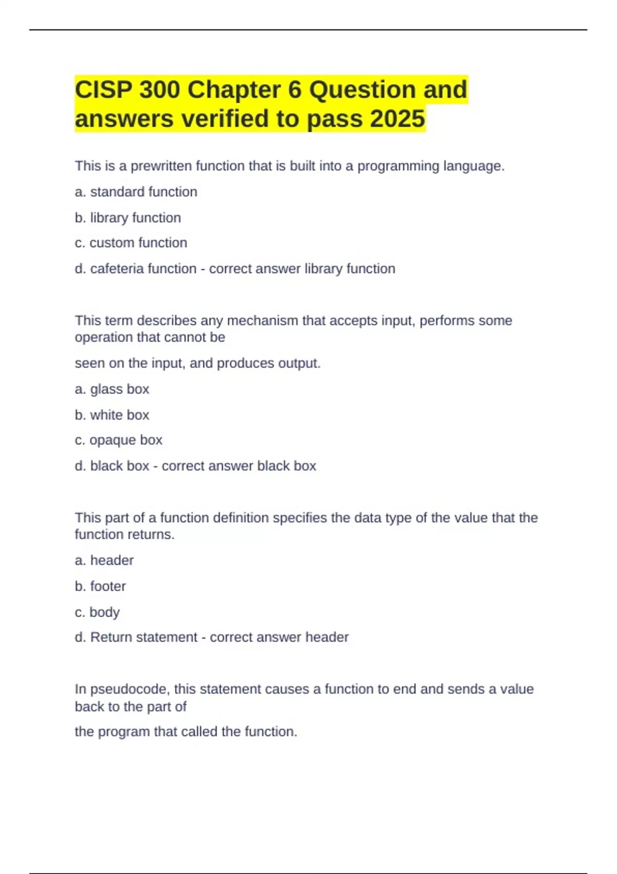 CISP 300 Chapter 6 Question and answers verified to pass 2025 This is a prewritten function that is built into a programming language. a. standard function b. library function c. custom function d. cafeteria function - correct answer library function This term describes any mechanism that accepts input, performs some operation that cannot be seen on the input, and produces output. a. glass box b. white box c. opaque box d. black box - correct answer black box This part of a function definition specifies the data type of the value that the function returns. a. header b. footer c. body d. Return statement - correct answer header In pseudocode, this statement causes a function to end and sends a value back to the part of the program that call