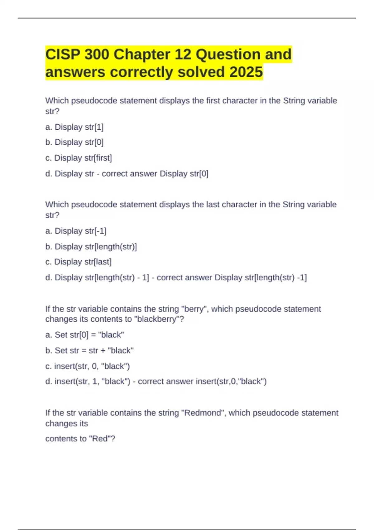 CISP 300 Chapter 12 Question and answers correctly solved 2025 Which pseudocode statement displays the first character in the String variable str? a. Display str[1] b. Display str[0] c. Display str[first] d. Display str - correct answer Display str[0] Which pseudocode statement displays the last character in the String variable str? a. Display str[-1] b. Display str[length(str)] c. Display str[last] d. Display str[length(str) - 1] - correct answer Display str[length(str) -1] If the str variable contains the string "berry", which pseudocode statement changes its contents to "blackberry"? a. Set str[0] = "black" b. Set str = str + "black" c. insert(str, 0, "black") d. insert(str, 1, "black") - correct answer insert(str,0,"black") If the str variable contains the string "Redmond", which pseudocode statement changes its contents to "Red"?