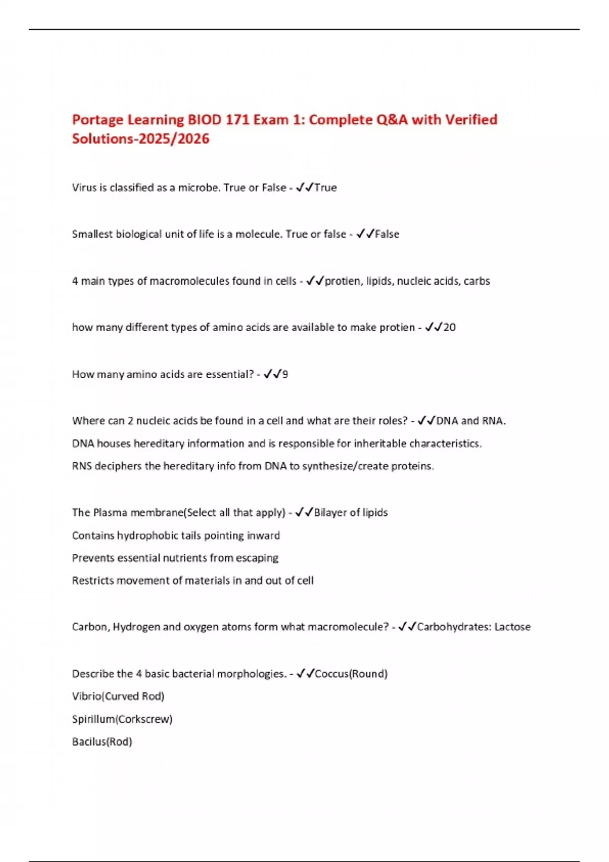 Portage Learning BIOD 171 Exam 1: Complete Q&A with Verified Solutions-2025/2026