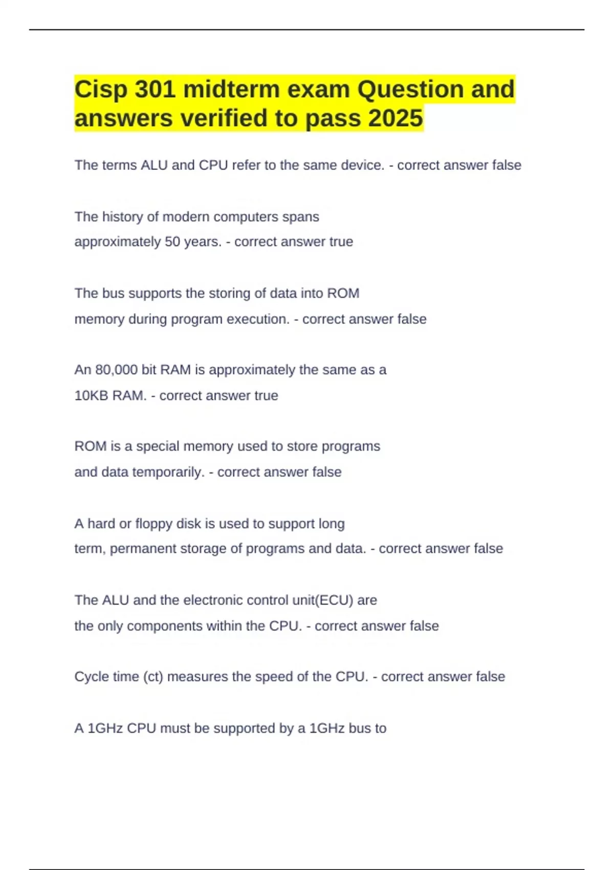 Cycle time (ct) measures the speed of the CPU. - correct answer false