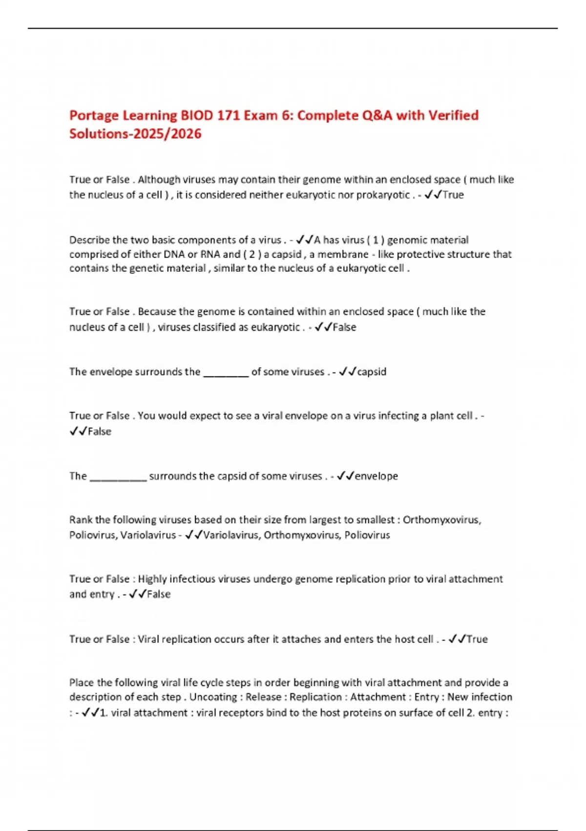 Portage Learning BIOD 171 Exam 6: Complete Q&A with Verified Solutions-2025/2026