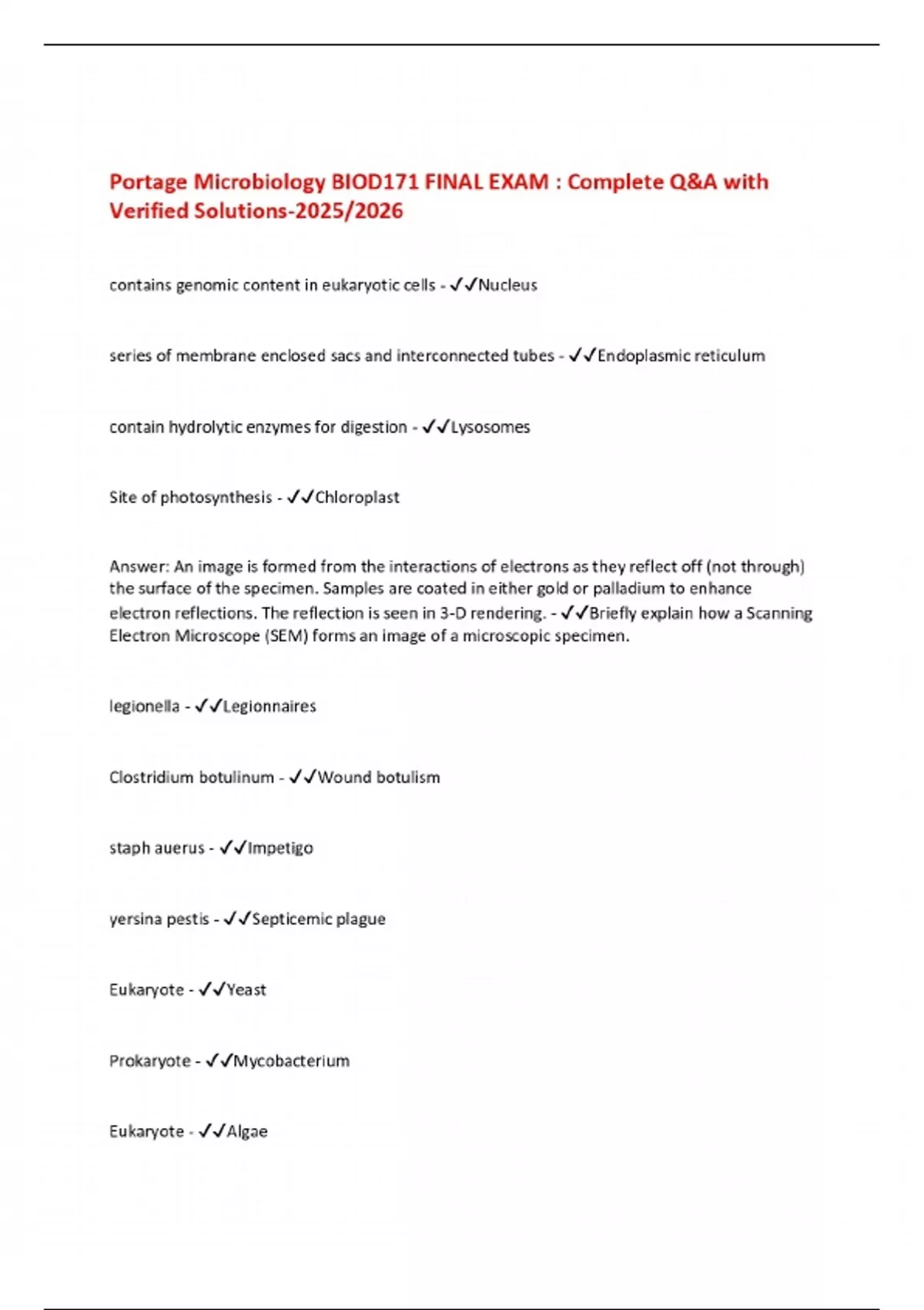Portage Microbiology BIOD171 FINAL EXAM : Complete Q&A with Verified Solutions-2025/2026