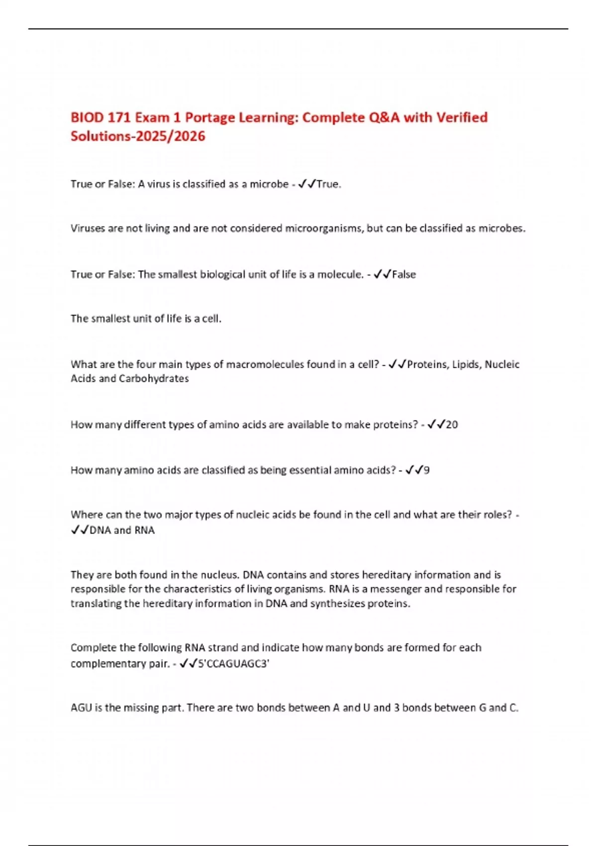 BIOD 171 Exam 1 Portage Learning: Complete Q&A with Verified Solutions-2025/2026