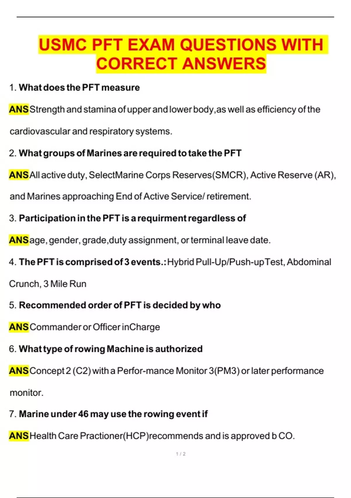 USMC PFT EXAM QUESTIONS WITH