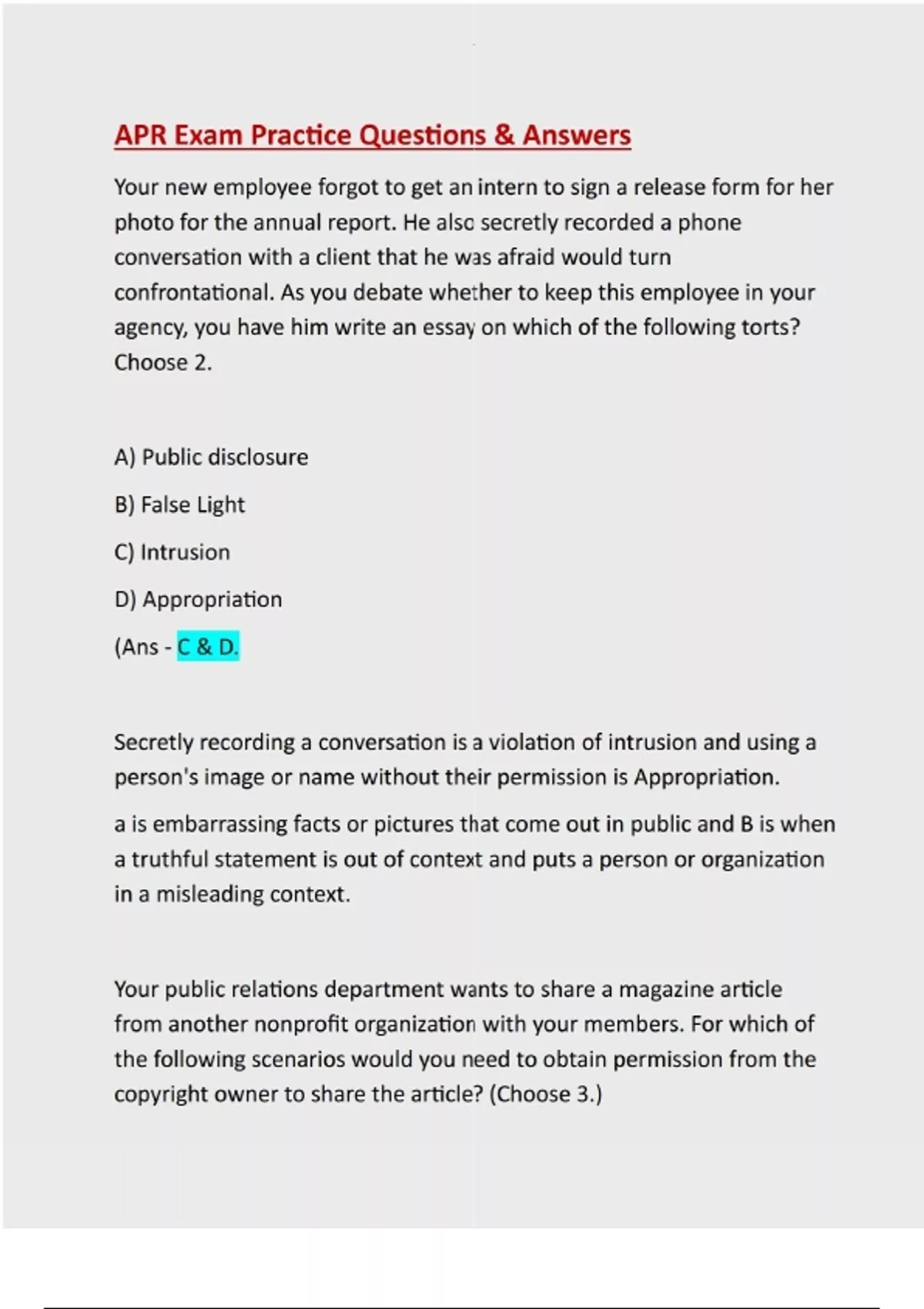 Your new employee forgot to get an intern to sign a release form for her photo for the annual report. He also secretly recorded a phone conversation with a client that he was afraid would turn confrontational. As you debate whether to keep this employee in your agency, you have him write an essay on which of the following torts? Choose 2. A) Public disclosure B) False Light C) Intrusion D) Appropriation (Ans - C & D. Secretly recording a conversation is a violation of intrusion and using a person's image or name without their permission is Appropriation. a is embarrassing facts or pictures that come out in public and B is when a truthful statement is out of context and puts a person or organization in a misleading context. Your public relations department wants to share a magazine article from another nonprofit organization with your members. For which of the following scenarios would you need to obtain permission from the copyright owner to share the article? (Choose 3.)A) If you email the article to the members of your organization B) If you send the members of your organization a link to the article on the other organization's website C) If you distribute the article to the members of your organization at its annual meeting D) If you reprint the article in your organization's newsletter (Ans- A, C, D It is election season and you are the public relations rep for a mayoral campaign in a fairly conservative town. It has been a tight race and there are only a few weeks left until Election Day. While looking for material for the next round of commercials, a campaign staffer hands you a transcript containing unflattering information about the opponent and illicit affairs he's had with several women other than his wife. The staffer said that this information was overheard by a former staffer of the opponent while at a local bar. This juicy information is exactly what is needed to damage the opponent's reputation and put your candidate over the top to win the election. Which would be the most ethical choice in this situation for handing the information you were given? 1. You can use the information because there is no reasonable expectation of privacy at a bar.2. You can not use the information since the former staffer (Ans- Answer: 4 Reasoning: Similar to "tortuous interference" liability claim by tobacco industry v. CBS for using information based on a source who was party to a standard confidentiality agreement as an employee of the tobacco industry. Source: AP Stylebook 2012, Briefing on Media Law, p. 333. As the public relations director for your company one of the functions of your office is to take photos at official company events. For this particular event your company hires a photographer outside of the company to take photos. One of the employees emails you and asks for copies of a few of the photos. What is the best response to provide to the employee?