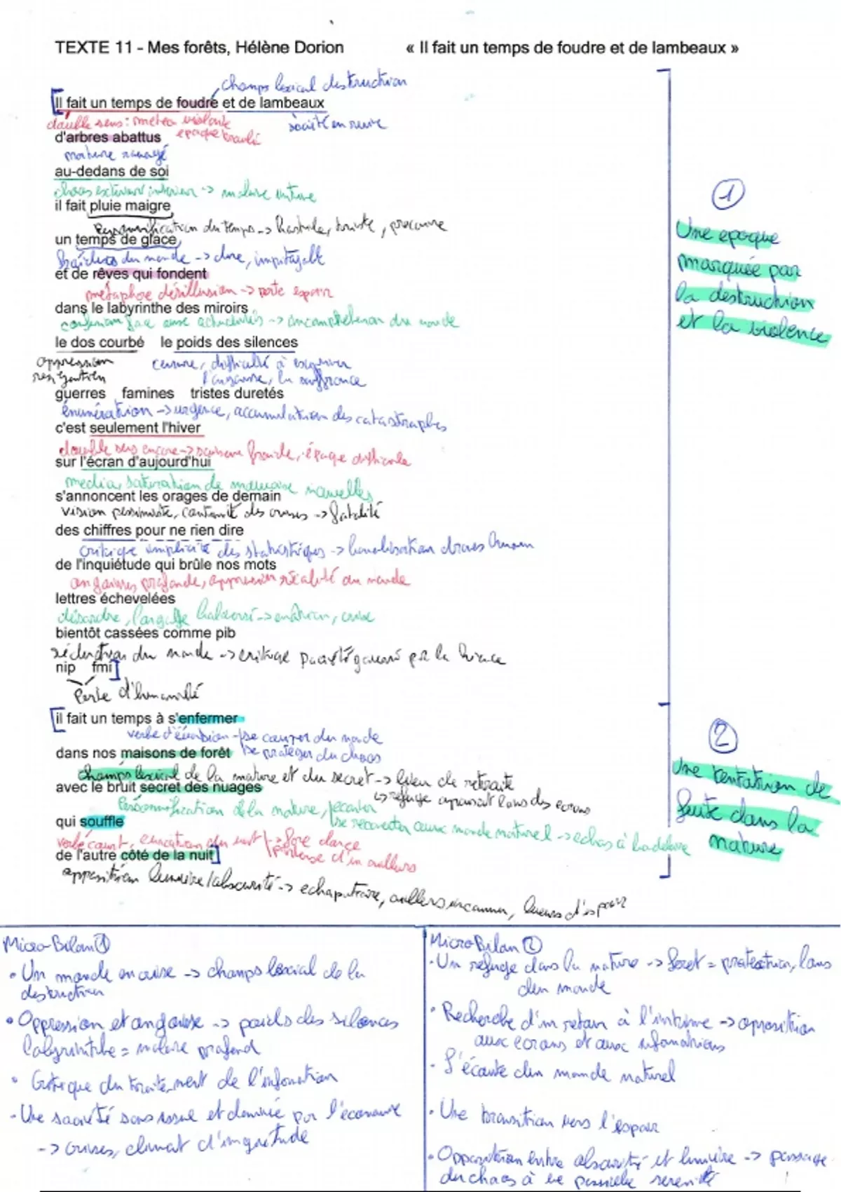 Ce document présente une analyse linéaire précise du poème « Il fait un temps de foudre et de lambeaux », extrait du recueil Mes forêts d’Hélène Dorion (2021). Le texte est commenté vers par vers : champs lexicaux, figures de style, thèmes, portée symbolique et interprétations sensibles. Une analyse littéraire complémentaire éclaire les grands enjeux du poème : dénonciation du chaos du monde contemporain, perte d’humanité, refuge dans la nature et quête d’intériorité. Cette fiche offre un double éclairage – critique et poétique – idéal pour l’oral du bac ou un devoir de type dissertation.