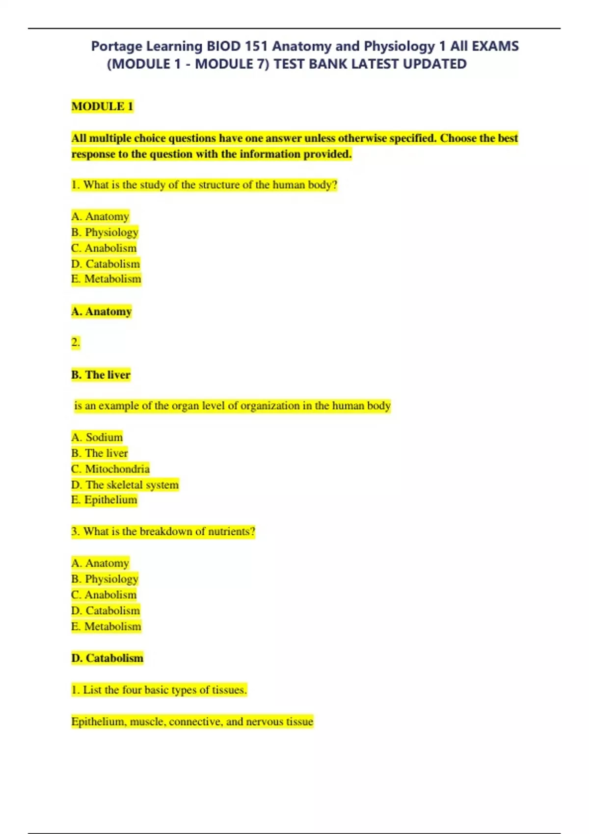 , Portage Learning BIOD 151 Anatomy and Physiology 1 All EXAMS