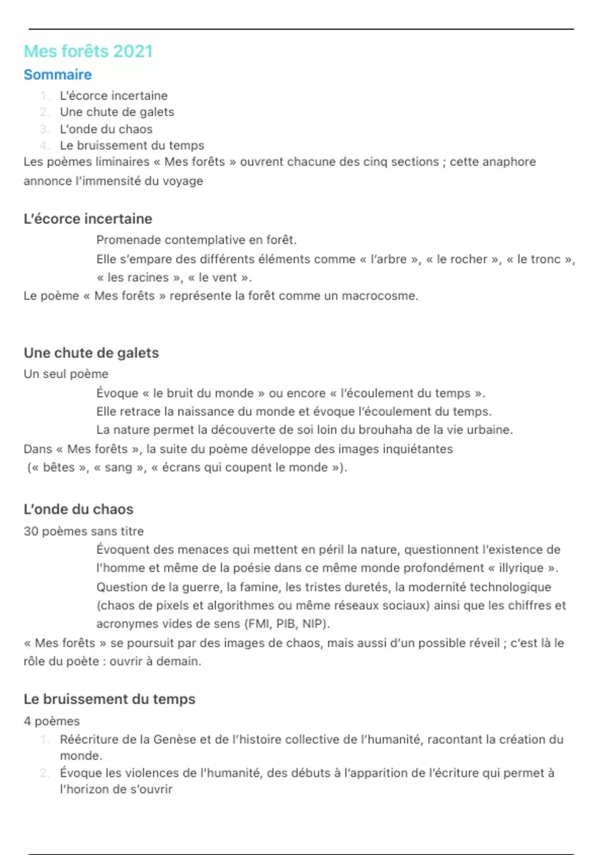 Les poèmes liminaires « Mes forêts » ouvrent chacune des cinq sections ; cette anaphore