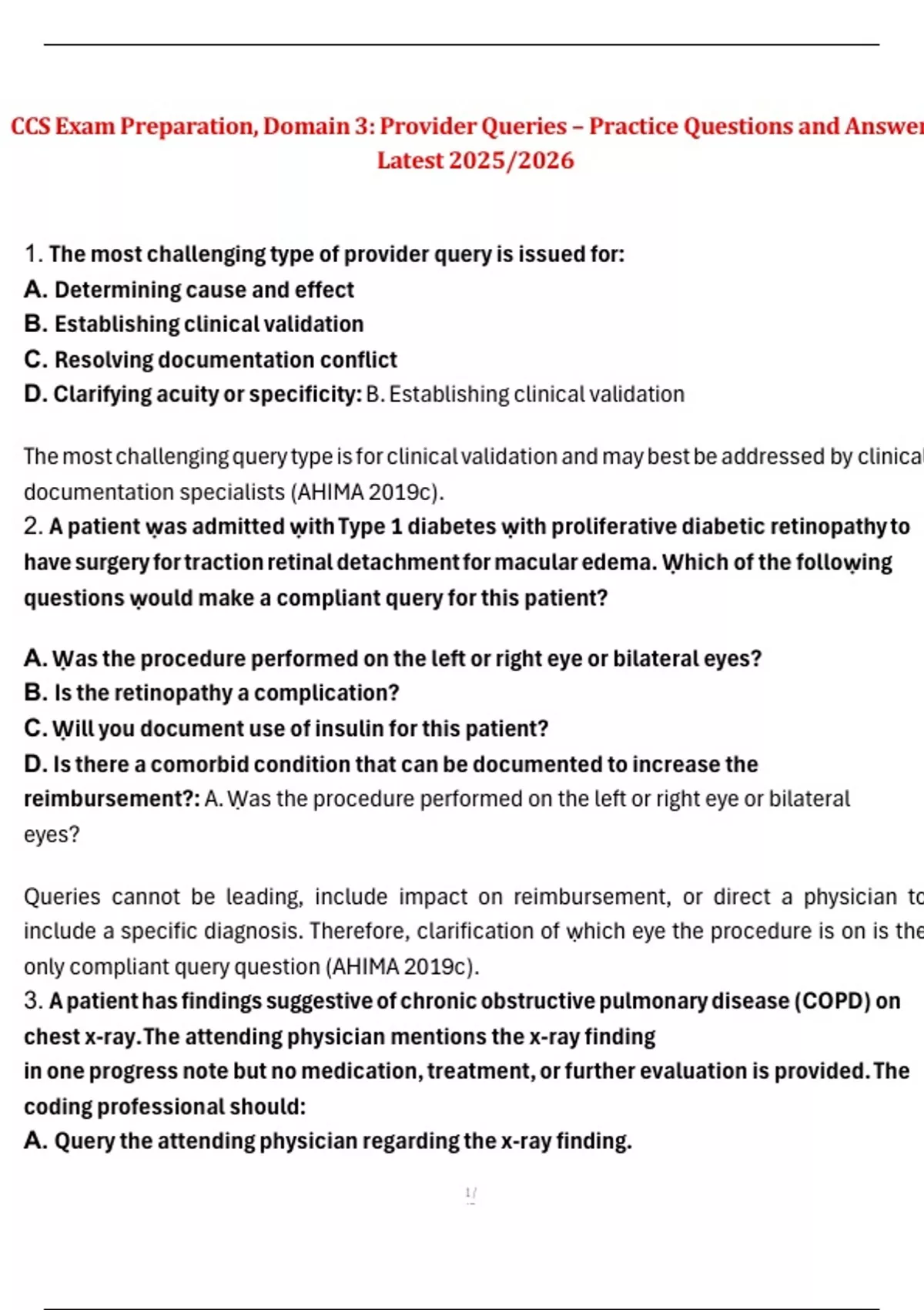 This document provides a focused set of practice questions and accurate answers for Domain 3: Provider Queries of the AHIMA Certified Coding Specialist (CCS) Exam, updated for the 2025/2026 cycle. It covers essential topics such as query best practices, clinical documentation improvement (CDI), ethical standards, compliant query writing, and provider communication. Ideal for candidates aiming to strengthen their understanding of provider query guidelines and documentation clarity requirements.