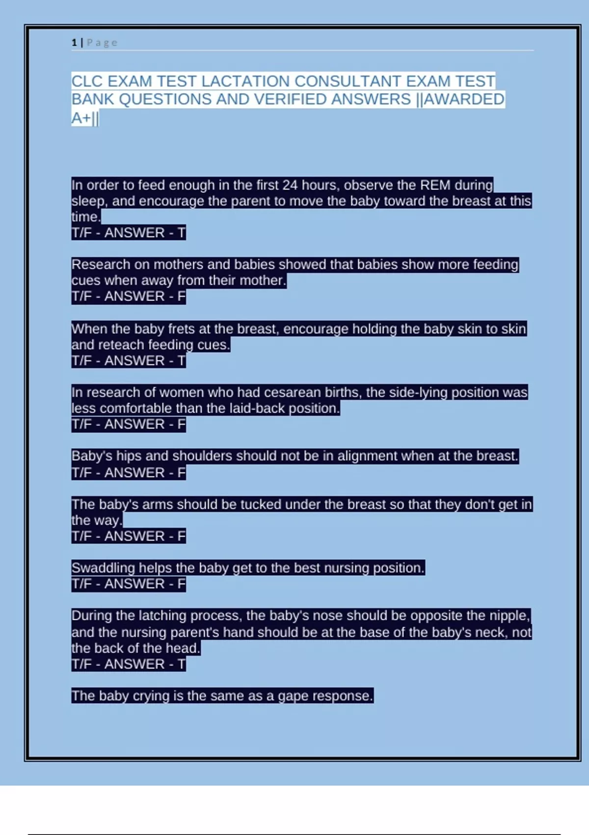 CLC EXAM TEST LACTATION CONSULTANT EXAM TEST BANK QUESTIONS AND VERIFIED ANSWERS ||AWARDED A+||