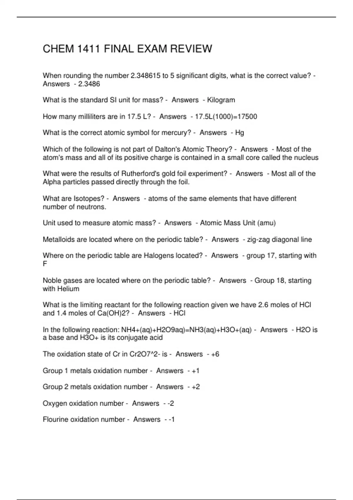 CHEM 1411 FINAL EXAM REVIEW