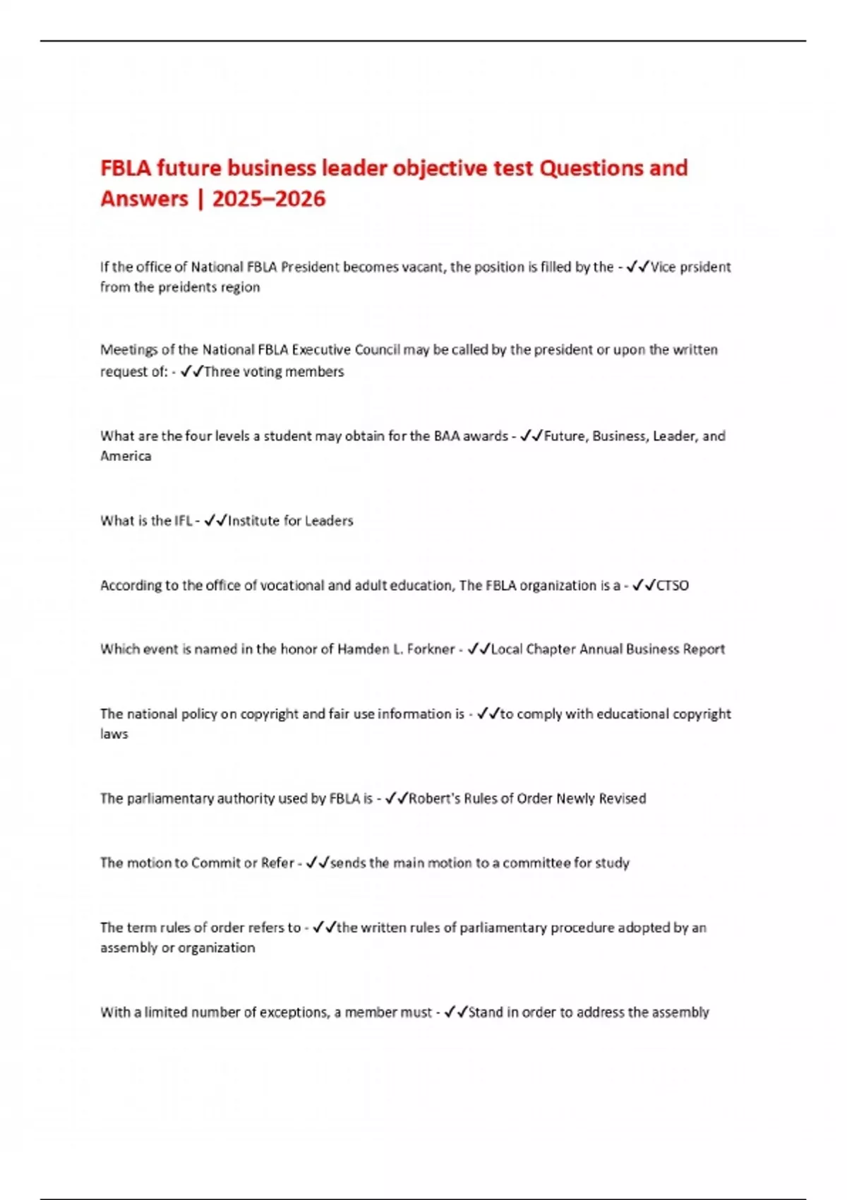 If the office of National FBLA President becomes vacant, the position is filled by the - Vice prsident from the preidents region Meetings of the National FBLA Executive Council may be called by the president or upon the written request of: - Three voting members What are the four levels a student may obtain for the BAA awards - Future, Business, Leader, and America What is the IFL - Institute for Leaders According to the office of vocational and adult education, The FBLA organization is a - CTSO Which event is named in the honor of Hamden L. Forkner - Local Chapter Annual Business Report The national policy on copyright and fair use information is - to comply with educational copyright laws The parliamentary authority used by FBLA is - Robert's Rules of Order Newly Revised The motion to Commit or Refer - sends the main motion to a committee for study The term rules of order refers to - the written rules of parliamentary procedure adopted by an assembly or organization