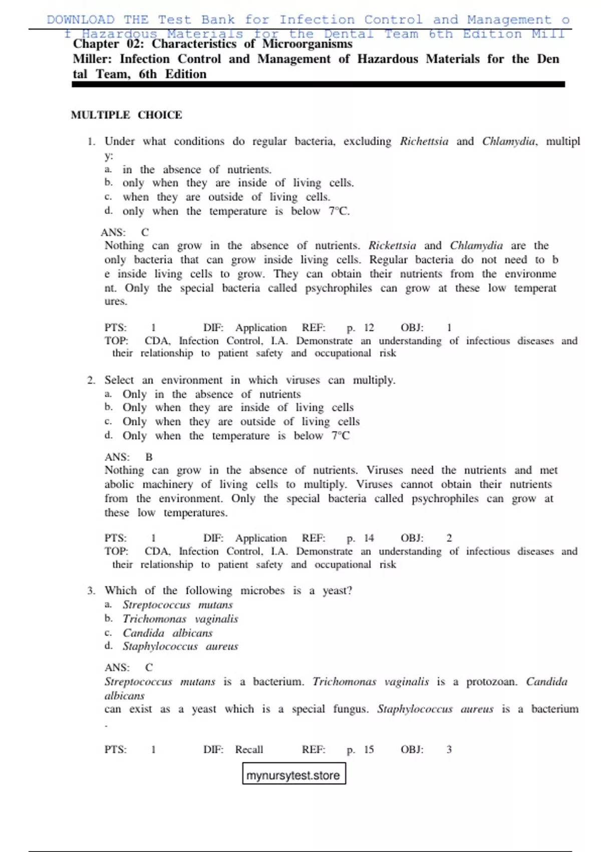DOWNLOAD THE Test Bank for Infection Control and Management of Hazardous Materials for tComplete Test Bank Infection Control and Management of Hazardous Materials for the Dental Team 6th Edition Miller Questions & Answers with rationales (Chapter 1-30) he Dental Team 6th Edition Miller