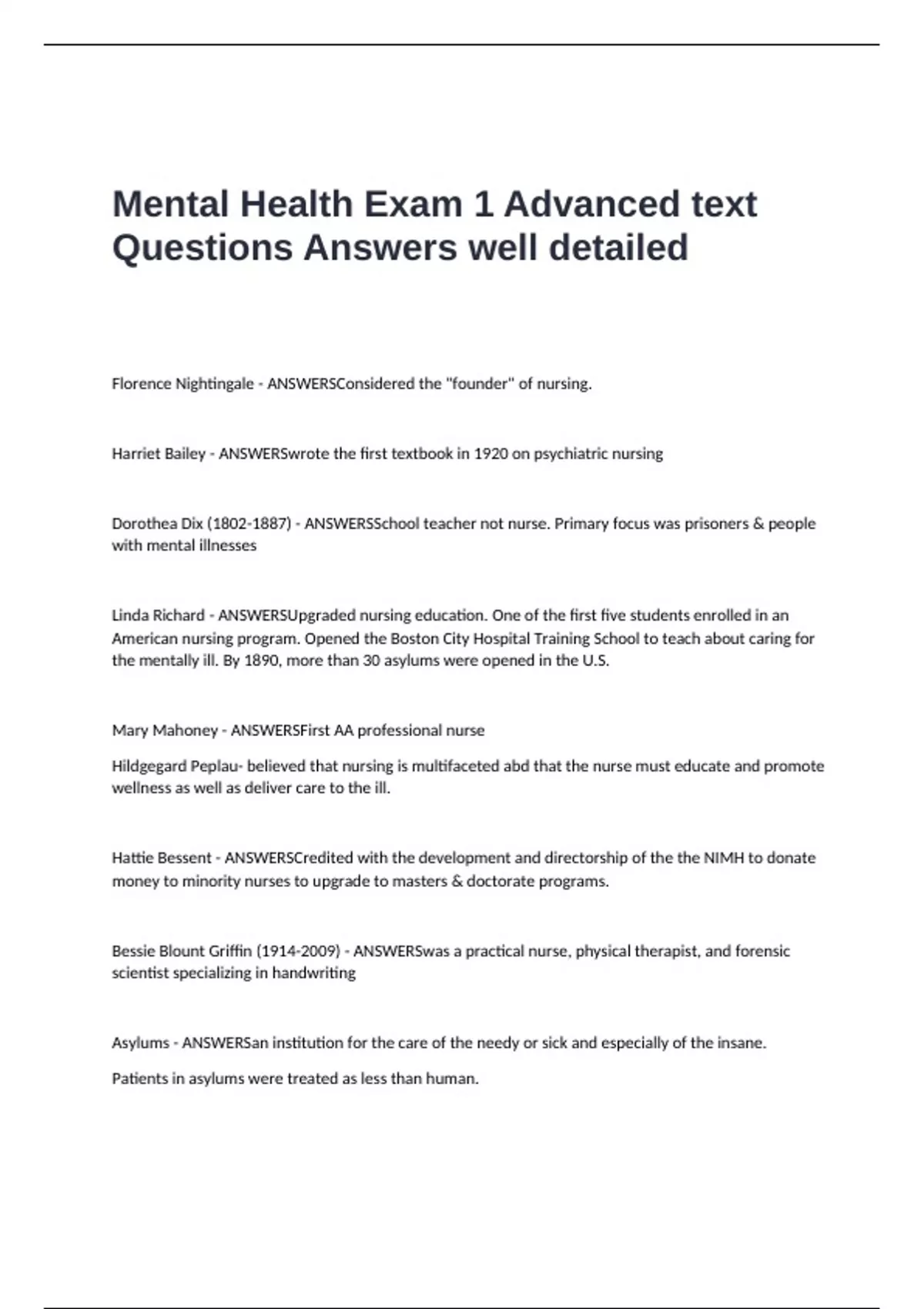 Dorothea Dix (1802-1887) - ANSWERSSchool teacher not nurse. Primary focus was prisoners & people