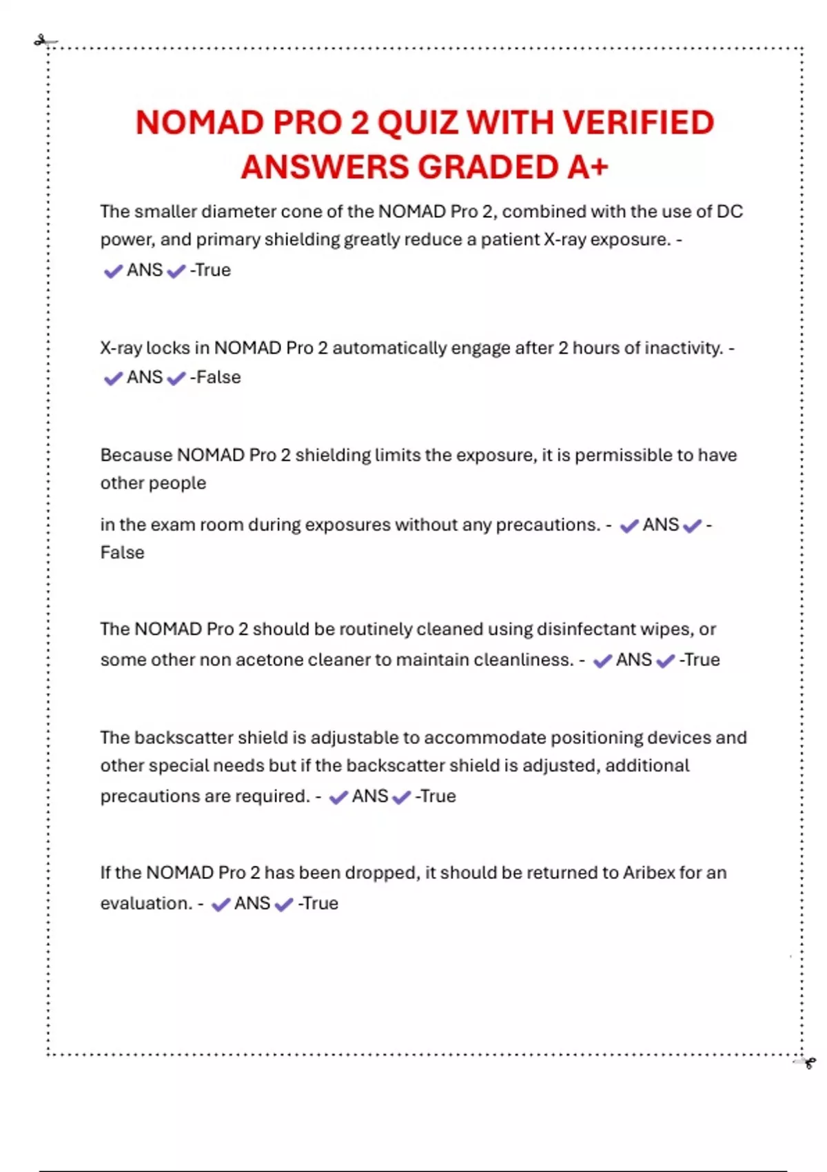 NOMAD PRO 2 QUIZ WITH VERIFIED ANSWERS GRADED A+ The smaller diameter cone of the NOMAD Pro 2, combined with the use of DC power, and primary shielding greatly reduce a patient X-ray exposure. - ANS -True X-ray locks in NOMAD Pro 2 automatically engage after 2 hours of inactivity. - ANS -False Because NOMAD Pro 2 shielding limits the exposure, it is permissible to have other people in the exam room during exposures without any precautions. - ANS - False The NOMAD Pro 2 should be routinely cleaned using disinfectant wipes, or some other non a