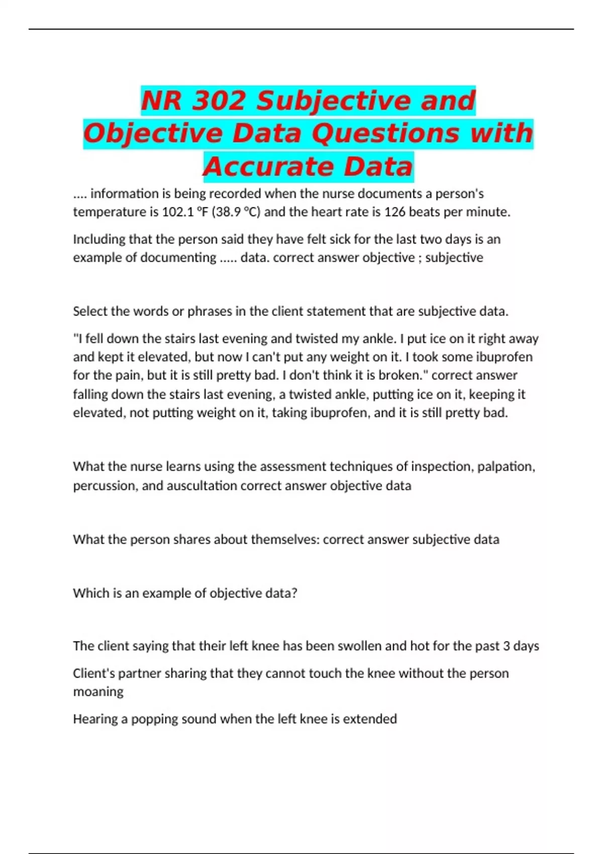 example of documenting ..... data. correct answer objective ; subjective
