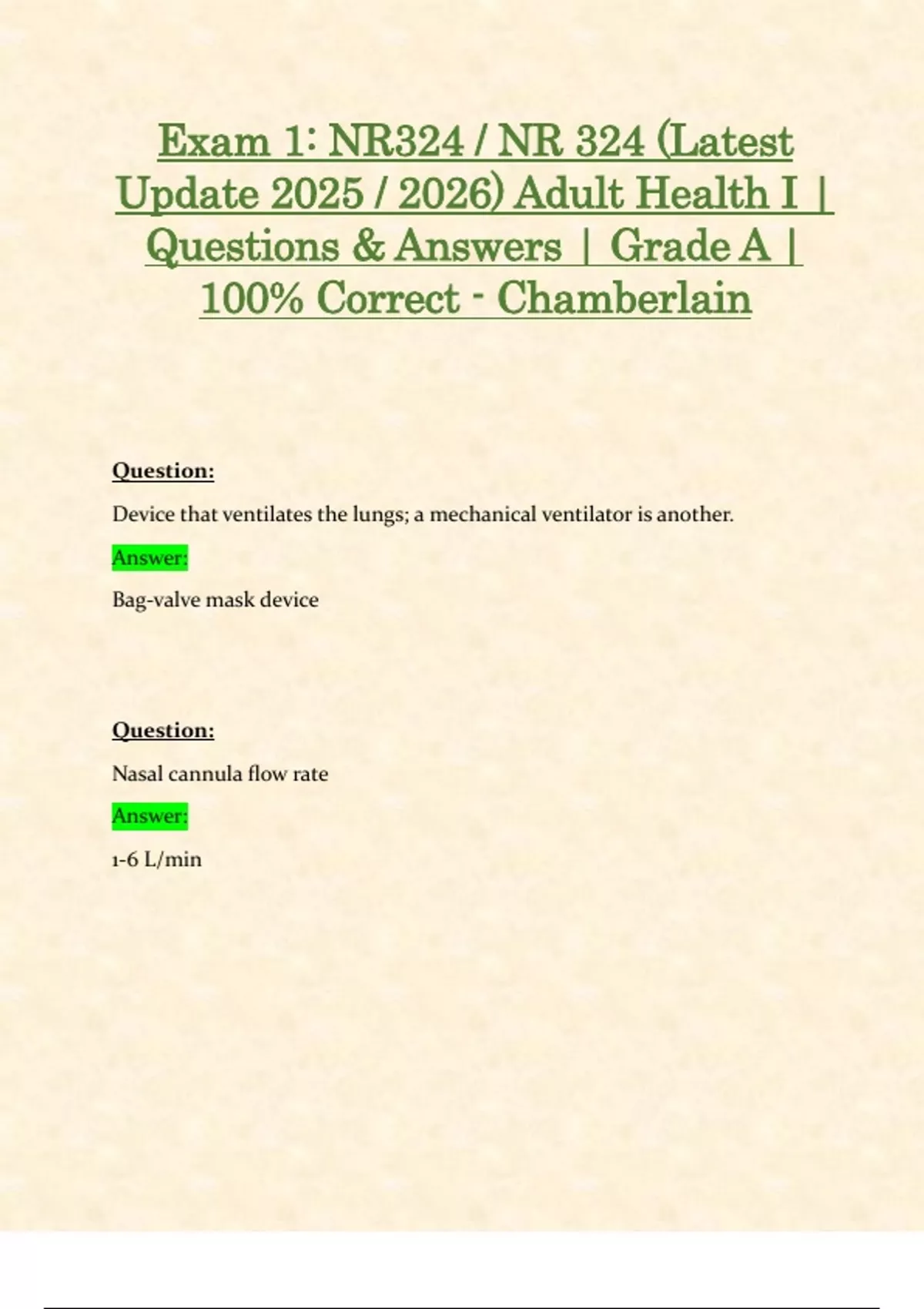 Exam 1: NR324 / NR 324 (Latest Update 2025 / 2026) Adult Health I | Questions & Answers | Grade A | 100% Correct - Chamberlain Question: Device that ventilates the lungs; a mechanical ventilator is another. Answer: Bag-valve mask device Question: Nasal cannula flow rate Answer: 1-6 L/min