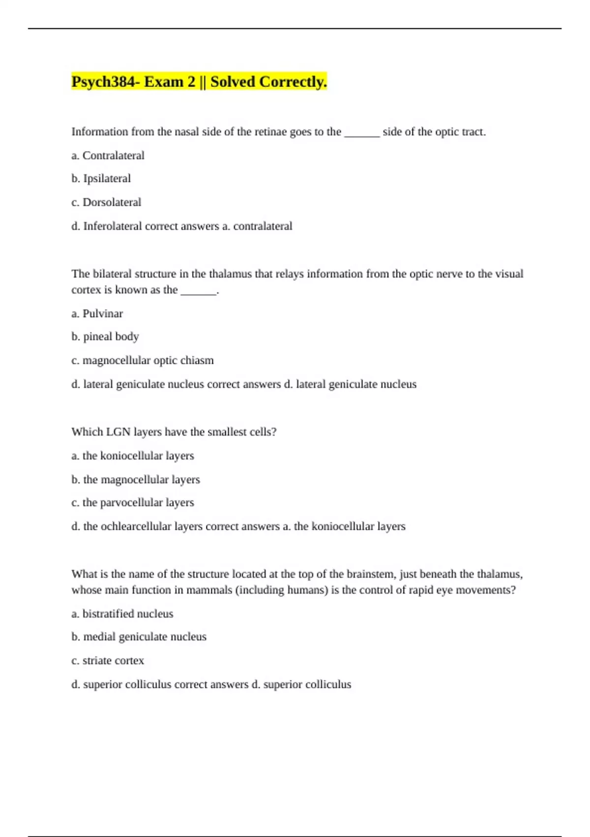 d. lateral geniculate nucleus correct answers d. lateral geniculate nucleus