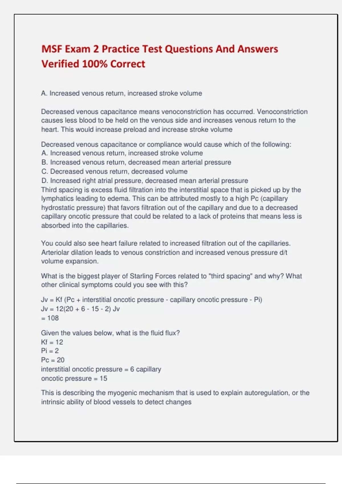 MSF Exam 2 Practice Test Questions And Answers Verified 100% Correct A. Increased venous return, increased stroke volume Decreased venous capacitance means venoconstriction has occurred. Venoconstriction causes less blood to be held on the venous side and increases venous return to the heart. This would increase preload and increase stroke volume Decreased venous capacitance or compliance would cause which of the following: A. Increased venous return, increased stroke volume B. Increased venous return, decreased mean arterial pressure C. Decreased venous return, decreased volume D. Increased right atrial pressure, decreased mean arterial pressure Third spacing is excess fluid filtration into the interstitial space that is picked up by the lymphatics leading to edema. This can be attributed mostly to a high Pc (capillary hydrostatic pressure) that favors filtration out of the capillary and due to a decreased capillary oncotic pressure that could be related to a lack of proteins that means less is absorbed into the capillaries. You could also see heart failure related to increased filtration out of the capillaries. Arteriolar dilation leads to venous constriction and increased venous pressure d/t volume expansion. What is the biggest player of Starling Forces related to "third spacing" and why? What other clinical symptoms could you see with this? Jv = Kf (Pc + interstitial oncotic pressure - capillary oncotic pressure - Pi) Jv = 12(20 + 6 - 15 - 2) Jv = 108 Given the values below, what is the fluid flux? Kf = 12 Pi = 2 Pc = 20 interstitial oncotic pressure = 6 capillary oncotic pressure = 15 This is describing the myogenic mechanism that is used to explain autoregulation, or the intrinsic ability of blood vessels to detect changes If the blood vessels are too rigid or don't have tension, autoregulation is not good What does this process describe? What would impede this? When the driving pressure increases the vessel is stretched. Intrinsic properties of the vessel detect the change and cause smooth muscle contraction -> reduced radius of vessel -> increases resistance and prevents a rise in blood flow. B. Prostaglandin is an agonist of vasodilation E. Epinephrine is an agonist of vasodilation and binds the beta-2-receptor (GPCR) adenylyl cyclase that increases cAMP and reduces the Ca sensitivity of contractile mechanisms Which two of these are not an agonist of vasoconstriction? A. Serotonin B. Prostaglandin C. Angiotensin II D. Endothelin E. Epinephrine A. Heat generating mechanisms like activating motor nerves on skeletal muscle You are an EMT and you come to a call where a patient has fallen into a pool in the dead of winter. What physiological process is occurring in his body to maintain his core temperature at "set point" when his hypothalamus senses its deviation below normal? A. Heat generating mechanisms like activating motor nerves on skeletal muscle B. Heat generating mechanisms like decreasing thyroid hormone production C. Heat generating mechanisms like water evaporating off of the body D. Heat dissipating mechanisms like peripheral vasodilation B. Heat stroke caused by severe tissue damage due to impaired heat dissipating mechanisms You are working in the ED and your patient works on construction sites during the middle of the summer. He is normally sure to drink plenty of fluids but today, the hottest day on record in Oklahoma, he does not have any water or Gatorade. What are you most likely treating him for right now in your ED after he lost consciousness on site after complaining of a terrible headache? A. Heat exhaustion due to loss of blood volume from excessive sweating B. Heat stroke caused by severe tissue damage due to impaired heat dissipating mechanisms C. Heat exhaustion caused by abnormally regulated Ca channels D. Heat stroke caused by inhibition of COX and prostaglandins C. Inotropic; cardiac glycosides (Oubain, digoxin) Positive inotropic effects increase tension and increased muscle force/contraction by increasing amount of intracellular calcium (stimulating sympathetic nervous system). Increases in a staircase-like fashion aka Bowditch Cardiac glycosides induce positive inotropic effects by inhibiting Na-K-ATPase in plasma membrane so sodium stays in the cell. This means the Na-Ca exchanger then slows down bc of altered gradient and keeps Ca in the cell to increase contractility. Chronotropic effects are related to heart rate Dromotropic effects are related to conduction velocity Which of the below is synonymous with contractility? What is a drug class that increases this? A. Chronotropic; diuretics B. Dromotropic; beta-blockers C. Inotropic; cardiac glycosides D. Chronotropic; beta-blockers E. Dromotropic; cardiac glycosides F. Inotropic; diuretics B. Preload is the end-diastolic volume. It puts the ventricle at a good length to later contract. This is also the first heart sound during auscultation A. Afterload is the aortic pressure. It's what the heart has to overcome to pump blood out aka the diastolic pressure C. Is when the second heart sound is heard Where is the preload and what does it correlate with? Where is the afterload and what does it correlate with? Stroke volume is the volume ejected from left ventricle in one heartbeat. It is the width of the P-V loop (SV = EDV - ESV). Positive inotropic effects increase the SV and therefore the width of the P-V loop